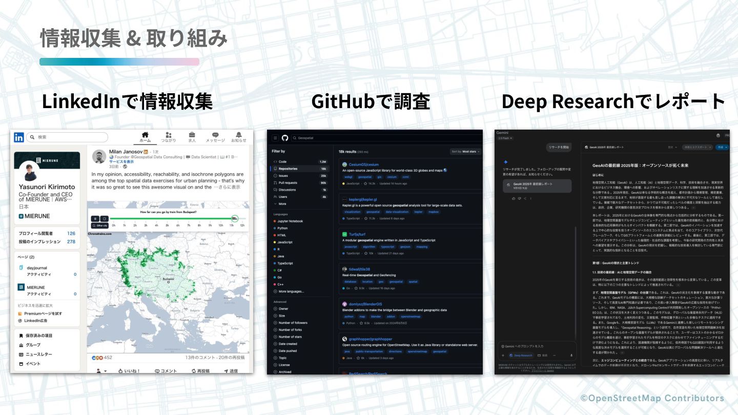 情報収集 & 取り組み LinkedInで情報収集 Deep Researchでレポート GitHubで調査