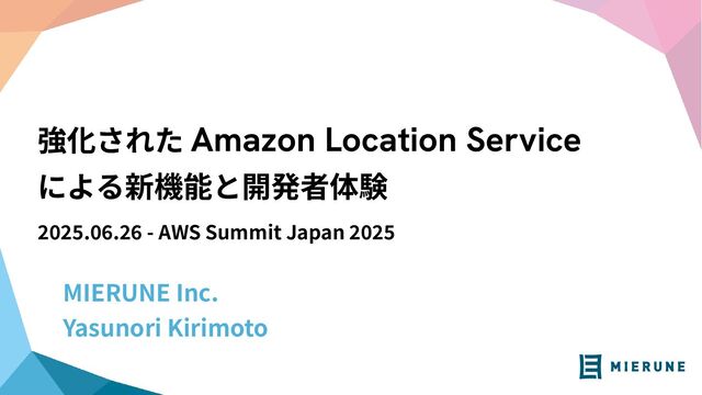MIERUNE Inc. Yasunori Kirimoto 強化された Amazon Location Service による新機能と開発者体験 2025.06.26