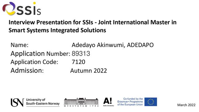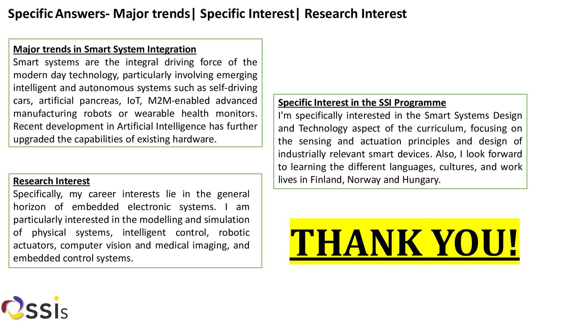 integral driving force of the modern day technology, particularly involving emerging intelligent and autonomous systems such as self-driving cars, artificial pancreas, IoT, M2M-enabled advanced manufacturing robots or wearable health monitors. Recent development in Artificial Intelligence has further upgraded the capabilities of existing hardware. Research Interest Specifically, my career interests lie in the general horizon of embedded electronic systems. I am particularly interested in the modelling and simulation of physical systems, intelligent control, robotic actuators, computer vision and medical imaging, and embedded control systems. Specific Interest in the SSI Programme I'm specifically interested in the Smart Systems Design and Technology aspect of the curriculum, focusing on the sensing and actuation principles and design of industrially relevant smart devices. Also, I look forward to learning the different languages, cultures, and work lives in Finland, Norway and Hungary. SpecificAnswers- Major trends| Specific Interest| Research Interest THANK YOU!