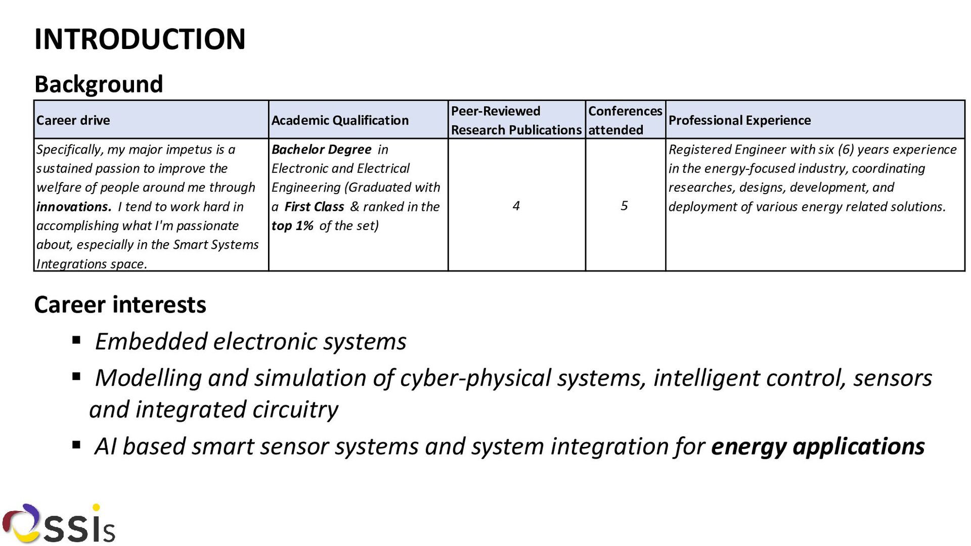 and simulation of cyber-physical systems, intelligent control, sensors and integrated circuitry ▪ AI based smart sensor systems and system integration for energy applications Career drive Academic Qualification Peer-Reviewed Research Publications Conferences attended Professional Experience Specifically, my major impetus is a sustained passion to improve the welfare of people around me through innovations. I tend to work hard in accomplishing what I'm passionate about, especially in the Smart Systems Integrations space. Bachelor Degree in Electronic and Electrical Engineering (Graduated with a First Class & ranked in the top 1% of the set) 4 5 Registered Engineer with six (6) years experience in the energy-focused industry, coordinating researches, designs, development, and deployment of various energy related solutions.