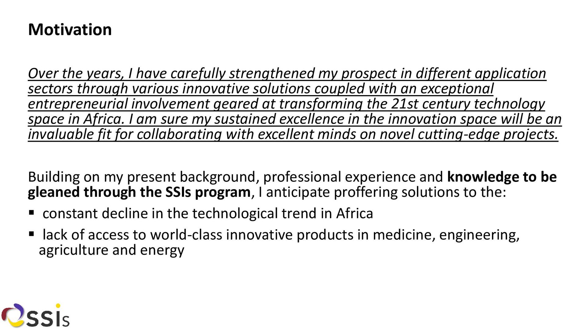 in different application sectors through various innovative solutions coupled with an exceptional entrepreneurial involvement geared at transforming the 21st century technology space in Africa. I am sure my sustained excellence in the innovation space will be an invaluable fit for collaborating with excellent minds on novel cutting-edge projects. Building on my present background, professional experience and knowledge to be gleaned through the SSIs program, I anticipate proffering solutions to the: ▪ constant decline in the technological trend in Africa ▪ lack of access to world-class innovative products in medicine, engineering, agriculture and energy