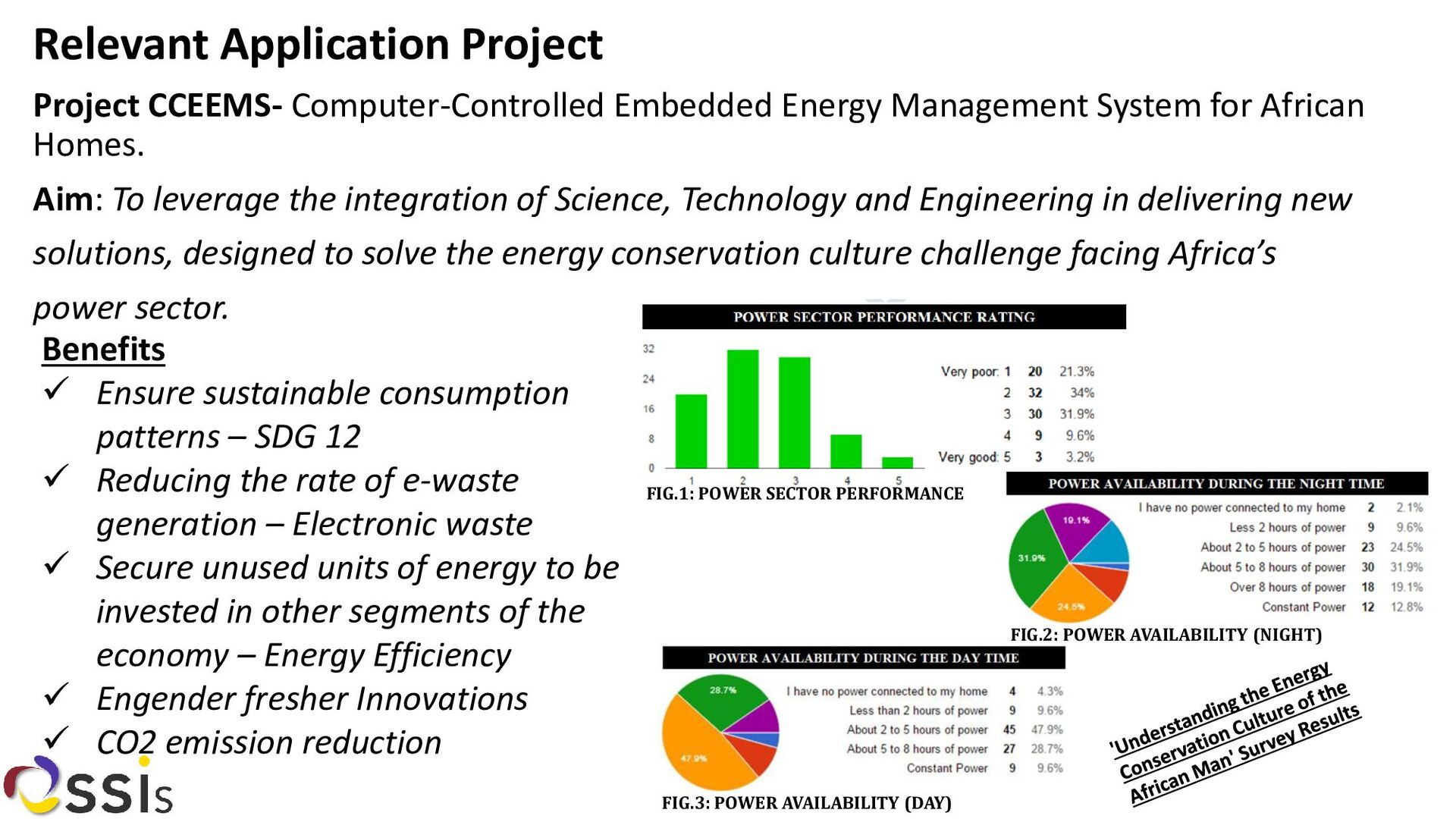 for African Homes. Aim: To leverage the integration of Science, Technology and Engineering in delivering new solutions, designed to solve the energy conservation culture challenge facing Africa’s power sector. Benefits ✓ Ensure sustainable consumption patterns – SDG 12 ✓ Reducing the rate of e-waste generation – Electronic waste ✓ Secure unused units of energy to be invested in other segments of the economy – Energy Efficiency ✓ Engender fresher Innovations ✓ CO2 emission reduction FIG.1: POWER SECTOR PERFORMANCE FIG.3: POWER AVAILABILITY (DAY) FIG.2: POWER AVAILABILITY (NIGHT)