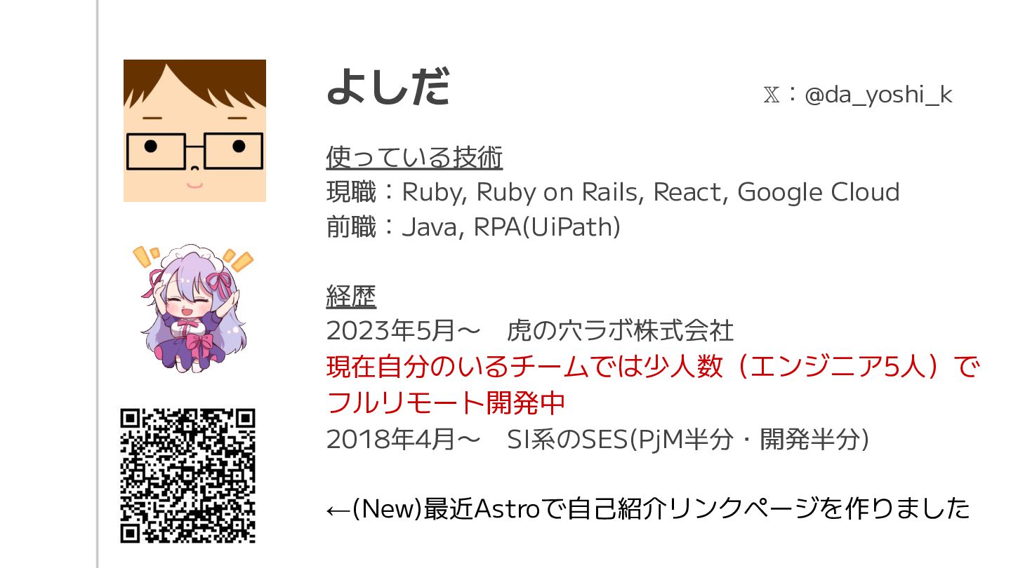 よしだ 𝕏:@da_yoshi_k 使っている技術 現職:Ruby, Ruby on Rails, React, Google Cloud