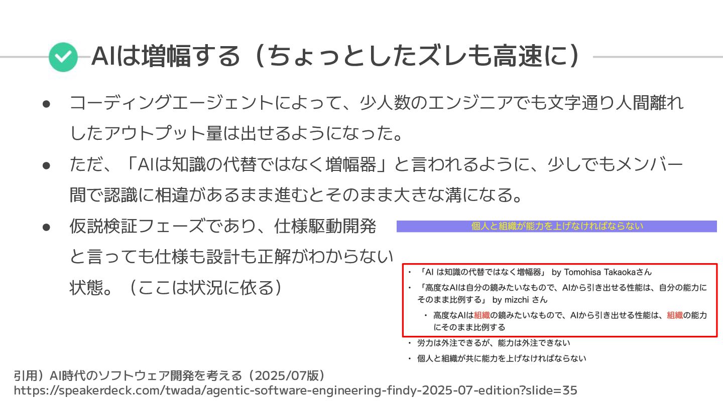 AIは増幅する(ちょっとしたズレも高速に) • コーディングエージェントによって、少人数のエンジニアでも文字通り人間離れ したアウトプット量は出せるようになった。 • ただ、「AIは知識の代替ではなく増幅器」と言われるように、少しでもメンバー 間で認識に相違があるまま進むとそのまま大きな溝になる。 • 仮説検証フェーズであり、仕様駆動開発 と言っても仕様も設計も正解がわからない