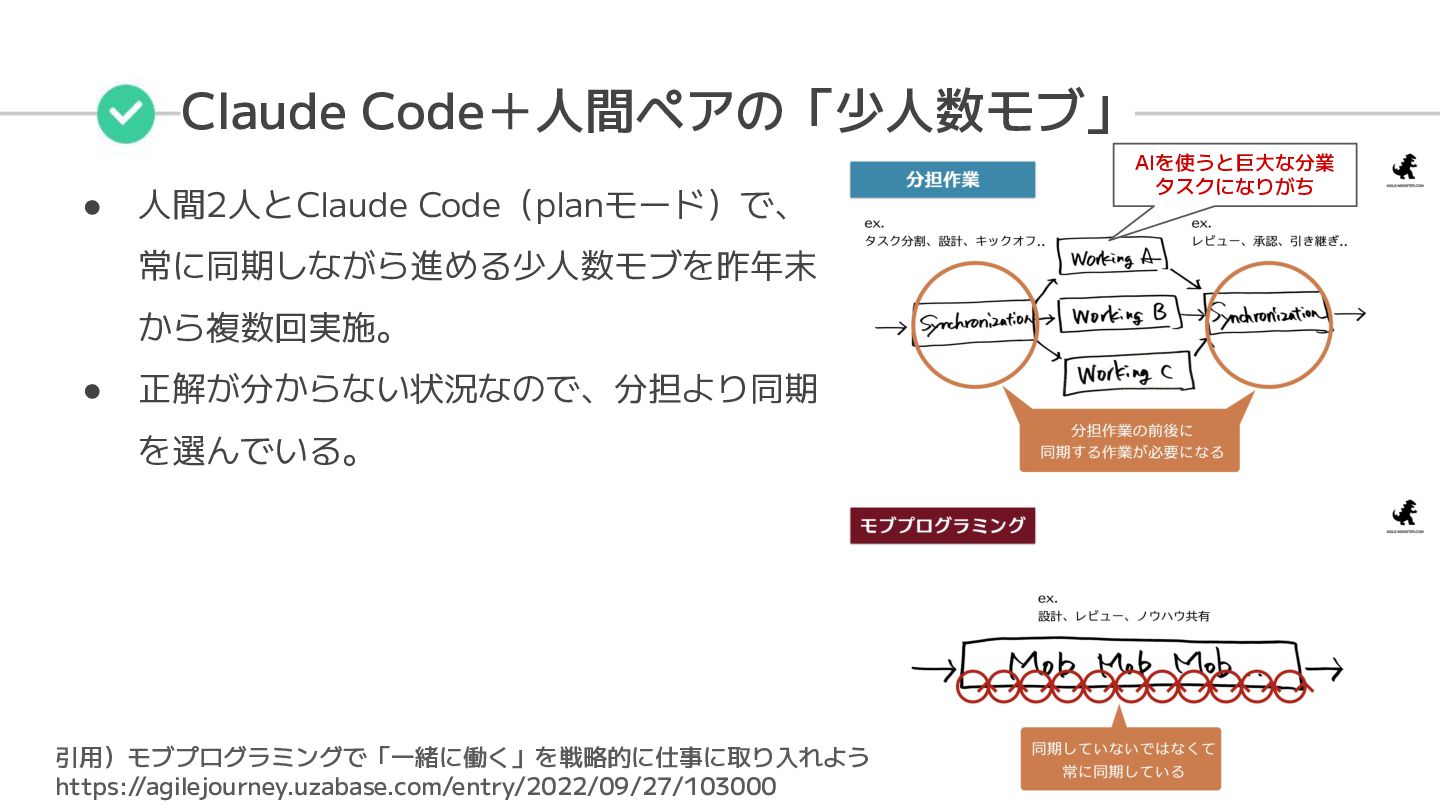 Claude Code+人間ペアの「少人数モブ」 • 人間2人とClaude Code(planモード)で、 常に同期しながら進める少人数モブを昨年末 から複数回実施。 • 正解が分からない状況なので、分担より同期 を選んでいる。