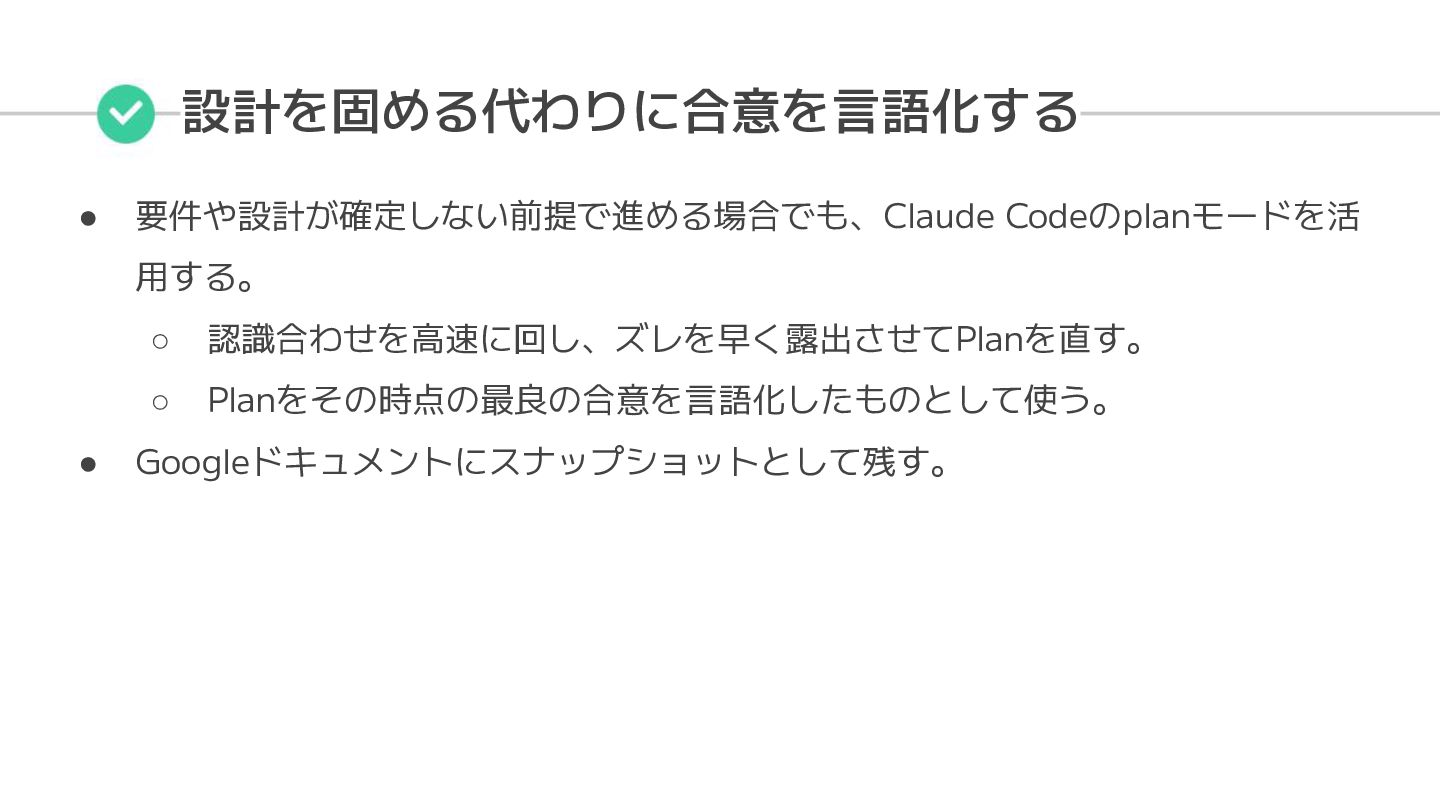 • 要件や設計が確定しない前提で進める場合でも、Claude Codeのplanモードを活 用する。 ◦ 認識合わせを高速に回し、ズレを早く露出させてPlanを直す。 ◦ Planをその時点の最良の合意を言語化したものとして使う。 • Googleドキュメントにスナップショットとして残す。