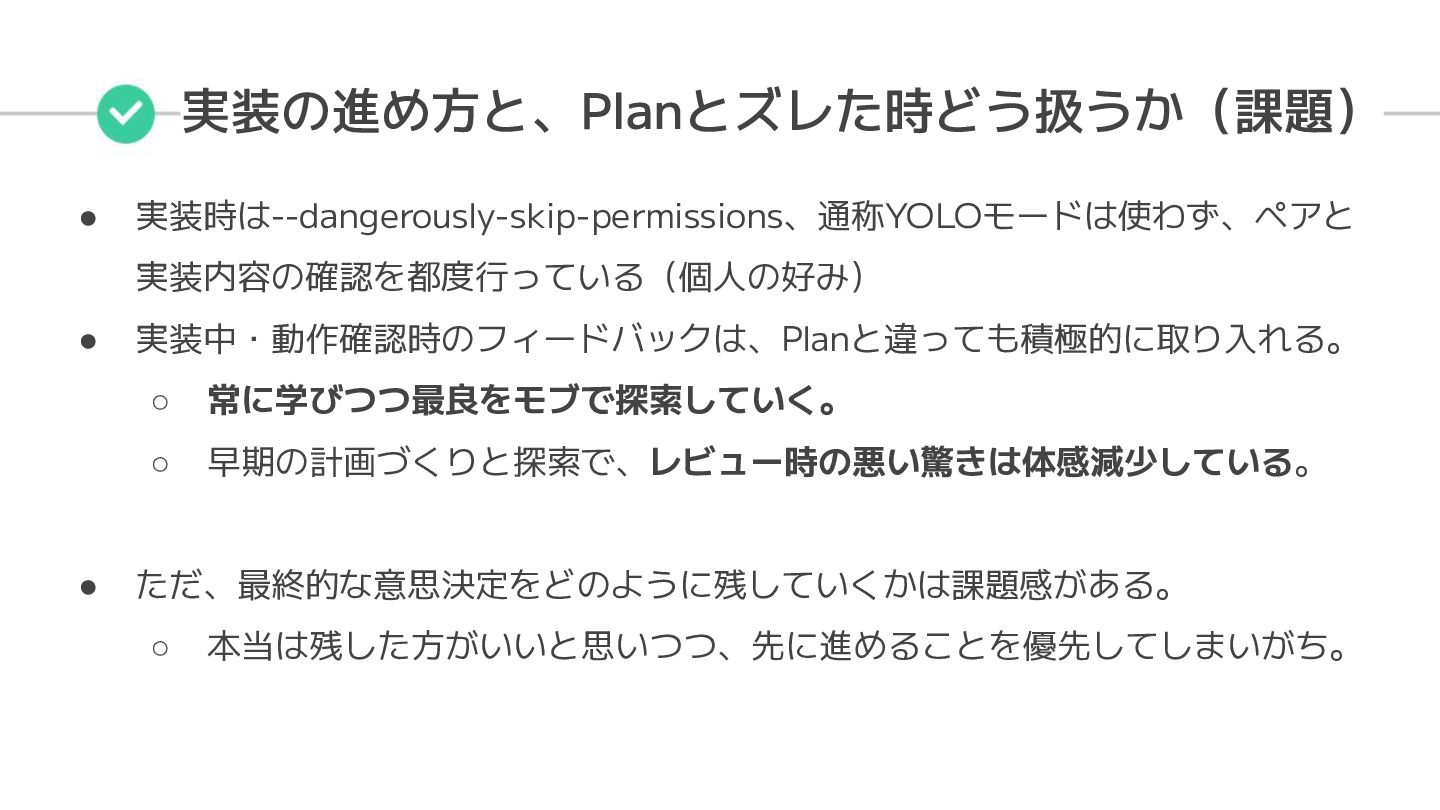 • 実装時は--dangerously-skip-permissions、通称YOLOモードは使わず、ペアと 実装内容の確認を都度行っている(個人の好み) • 実装中・動作確認時のフィードバックは、Planと違っても積極的に取り入れる。 ◦ 常に学びつつ最良をモブで探索していく。 ◦ 早期の計画づくりと探索で、レビュー時の悪い驚きは体感減少している。 •