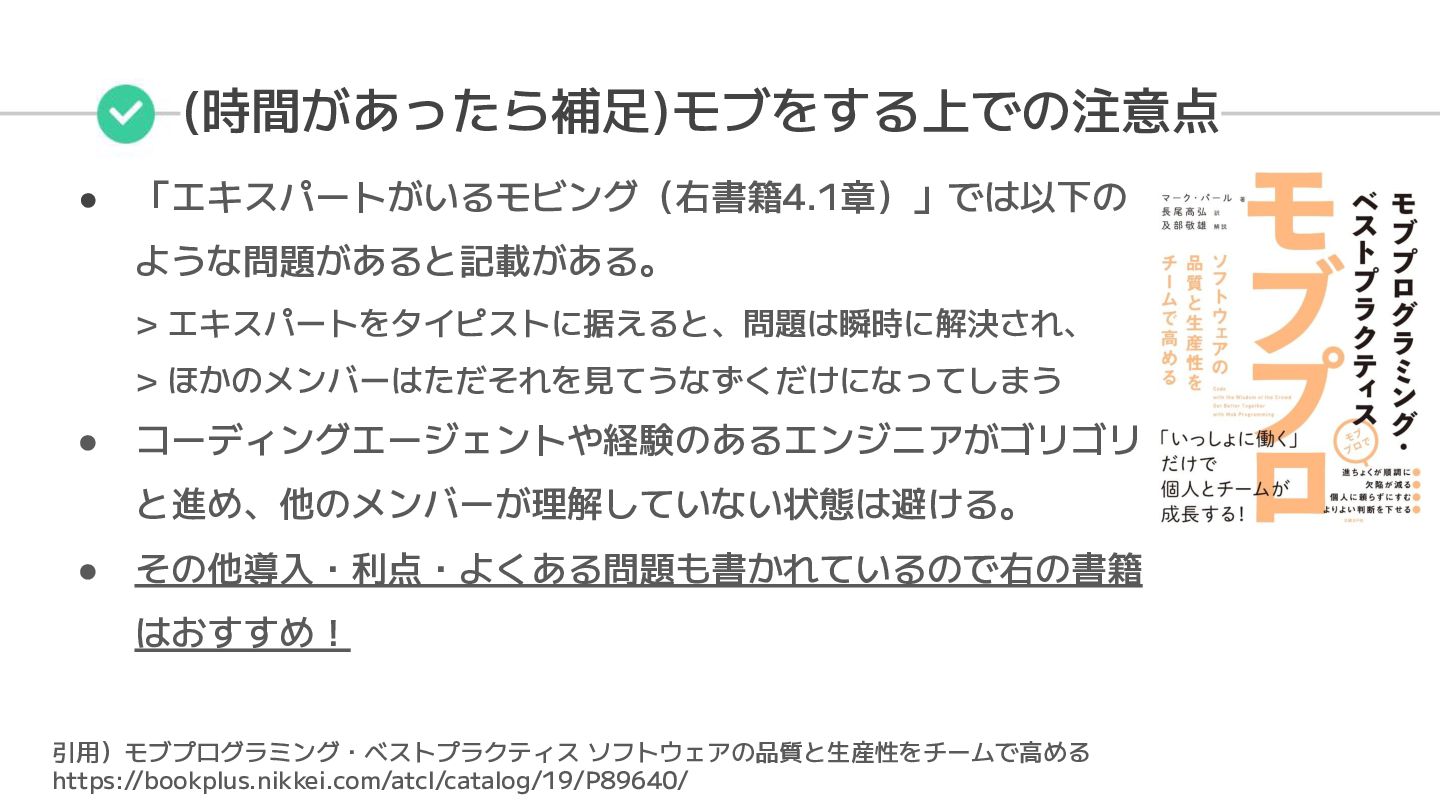 • その他導入・利点・よくある問題も書かれているので右の書籍 はおすすめ! (時間があったら補足)モブをする上での注意点 引用)モブプログラミング・ベストプラクティス ソフトウェアの品質と生産性をチームで高める https://bookplus.nikkei.com/atcl/catalog/19/P89640/