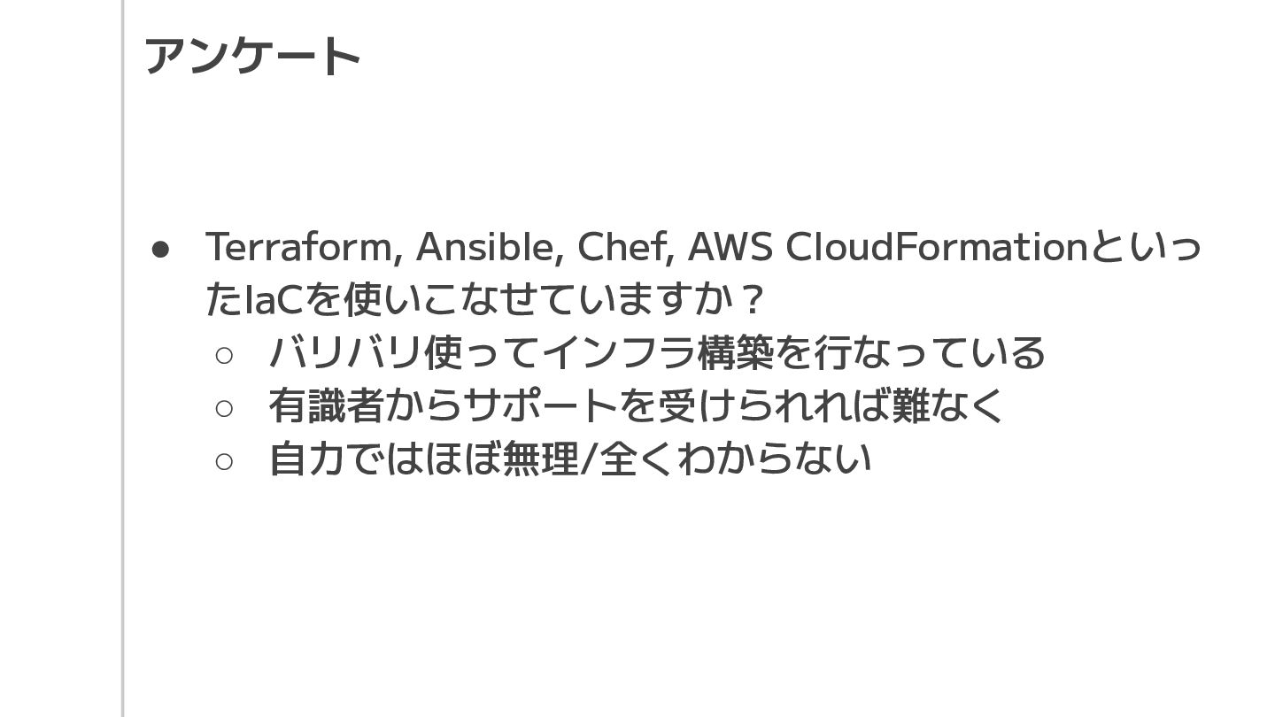 • Terraform, Ansible, Chef, AWS CloudFormationといっ たIaCを使いこなせていますか? ◦ バリバリ使ってインフラ構築を行なっている ◦