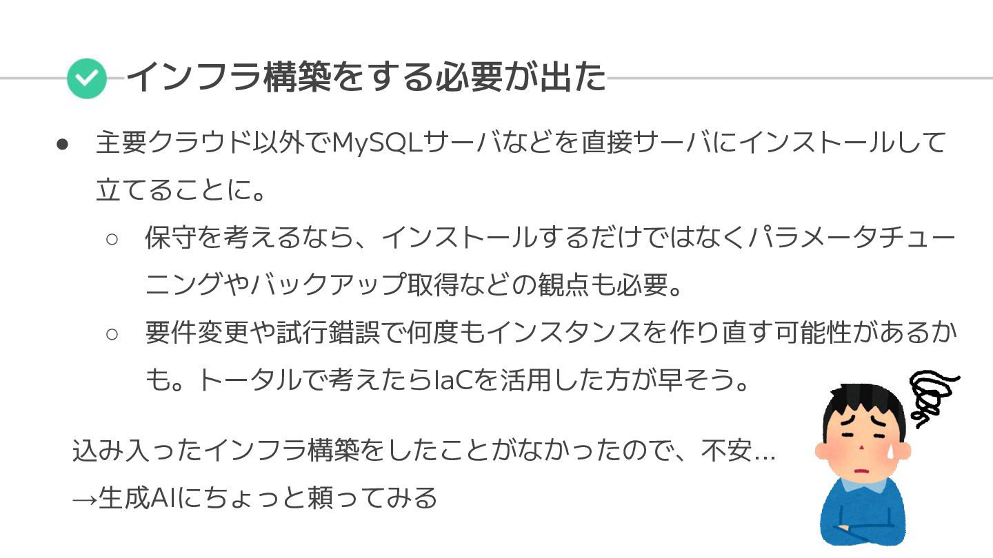 インフラ構築をする必要が出た • 主要クラウド以外でMySQLサーバなどを直接サーバにインストールして 立てることに。 ◦ 保守を考えるなら、インストールするだけではなくパラメータチュー ニングやバックアップ取得などの観点も必要。 ◦ 要件変更や試行錯誤で何度もインスタンスを作り直す可能性があるか も。トータルで考えたらIaCを活用した方が早そう。