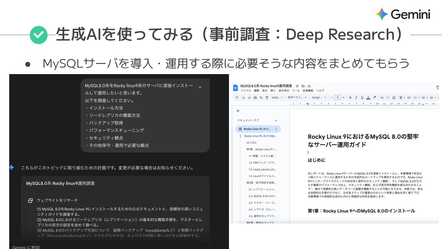 生成AIを使ってみる(事前調査:Deep Research) • MySQLサーバを導入・運用する際に必要そうな内容をまとめてもらう