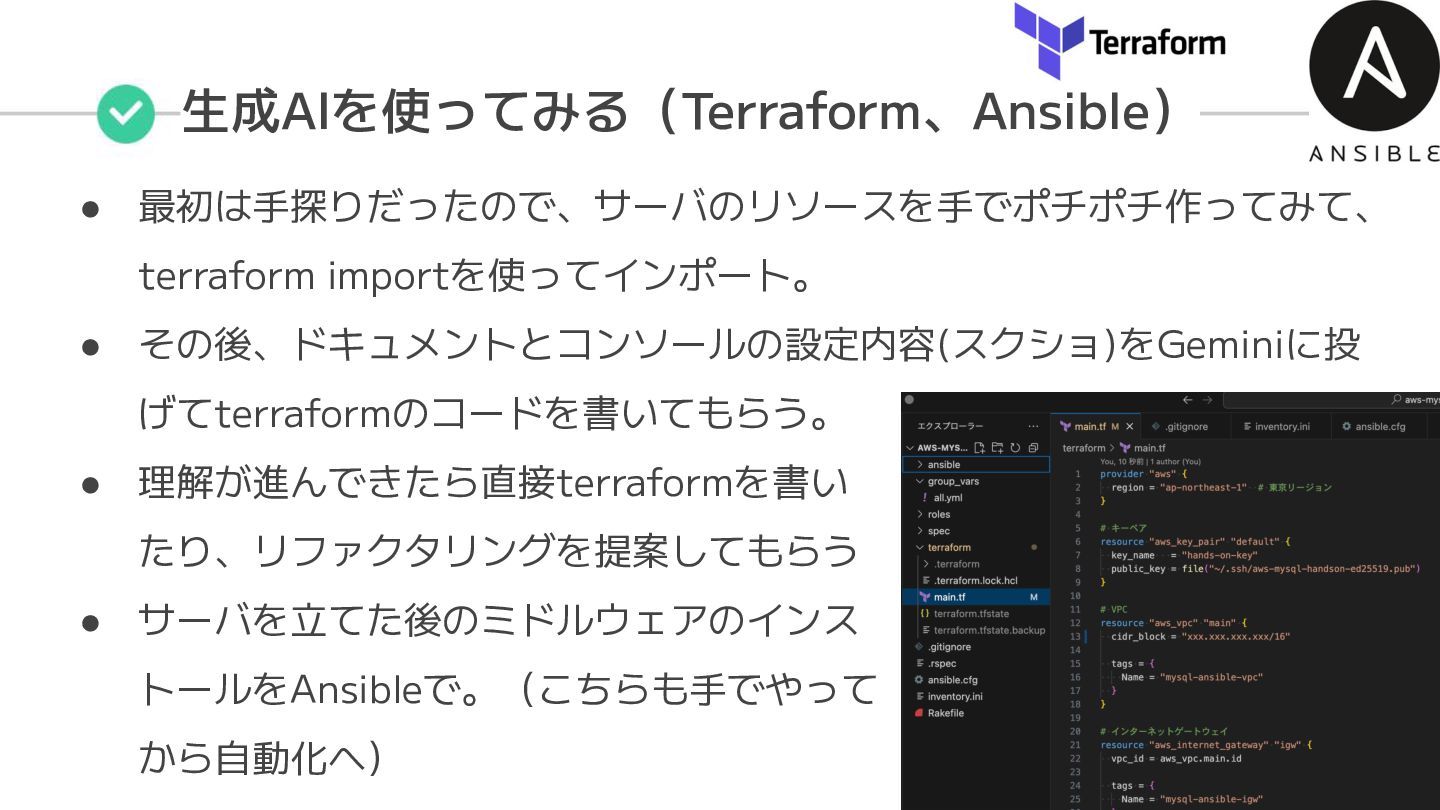 生成AIを使ってみる(Terraform、Ansible) • 最初は手探りだったので、サーバのリソースを手でポチポチ作ってみて、 terraform importを使ってインポート。 • その後、ドキュメントとコンソールの設定内容(スクショ)をGeminiに投 げてterraformのコードを書いてもらう。 • 理解が進んできたら直接terraformを書い