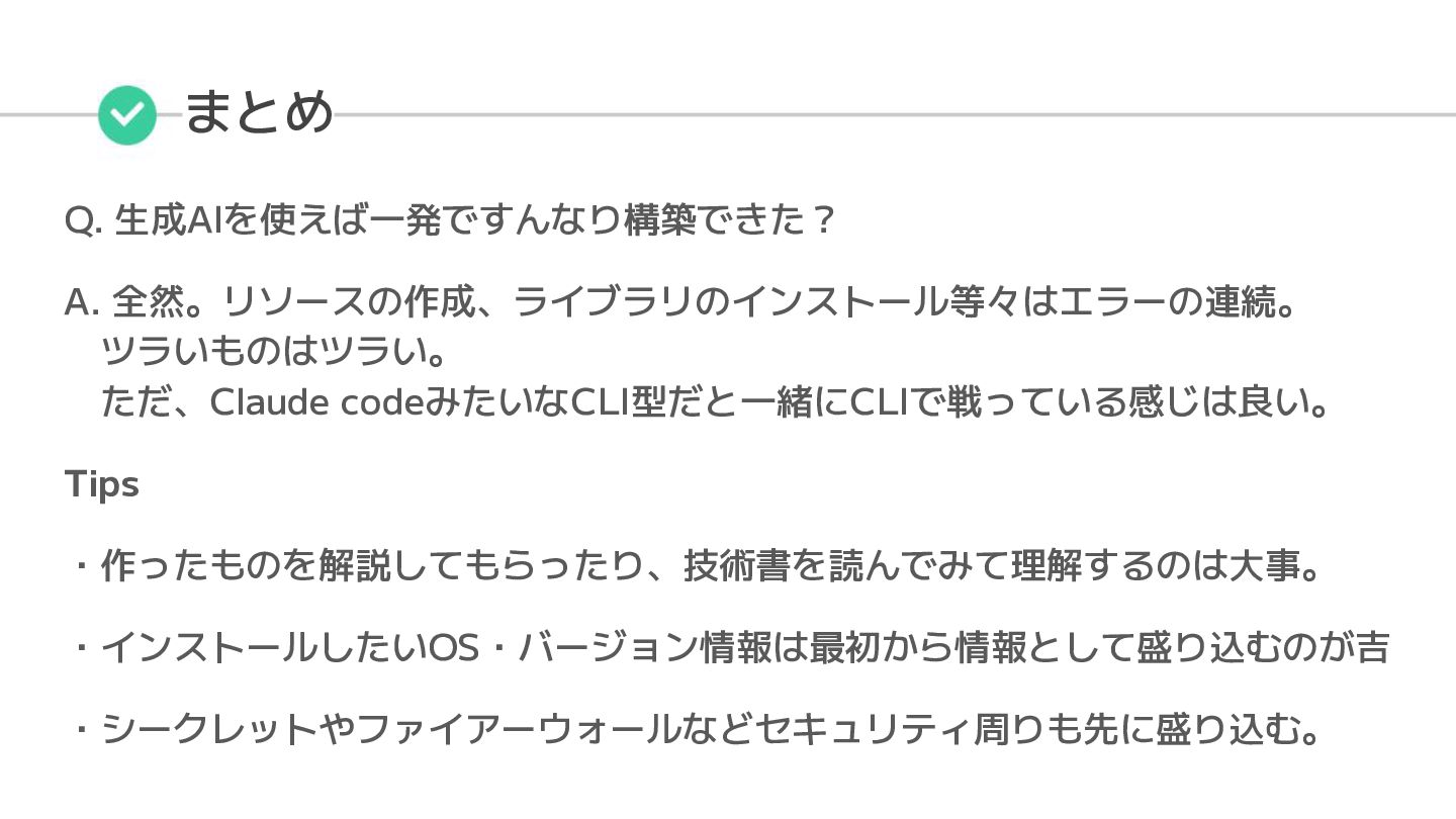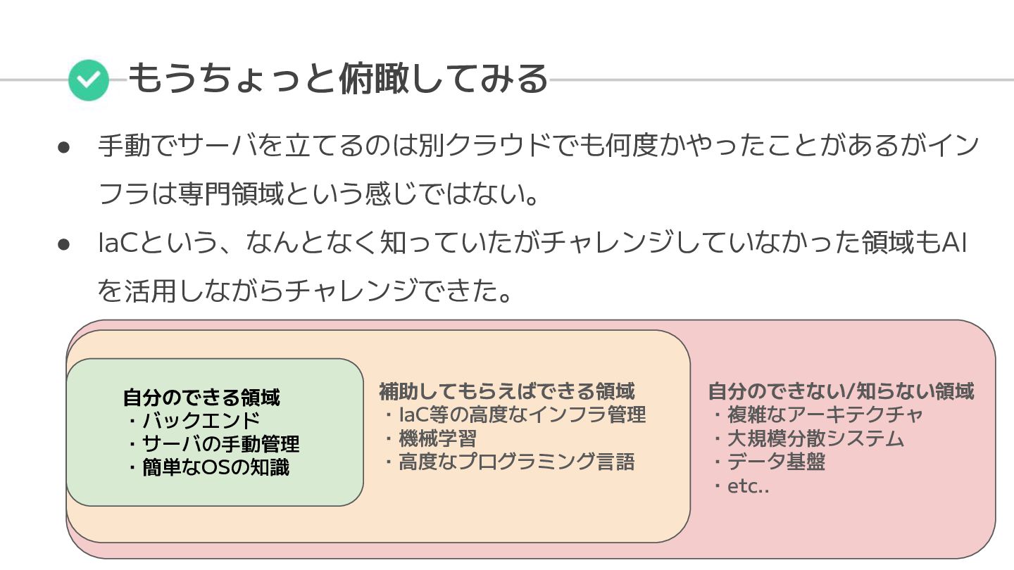 もうちょっと俯瞰してみる • 手動でサーバを立てるのは別クラウドでも何度かやったことがあるがイン フラは専門領域という感じではない。 • IaCという、なんとなく知っていたがチャレンジしていなかった領域もAI を活用しながらチャレンジできた。 自分のできる領域 ・バックエンド ・サーバの手動管理