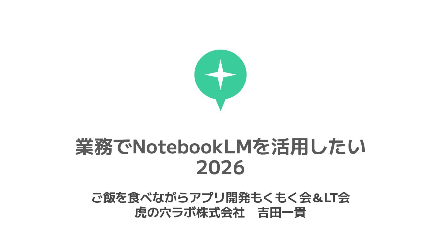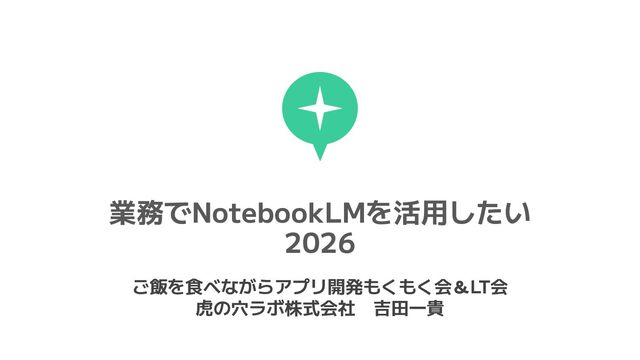 業務でNotebookLMを活用したい 2026 ご飯を食べながらアプリ開発もくもく会&LT会 虎の穴ラボ株式会社 吉田一貴