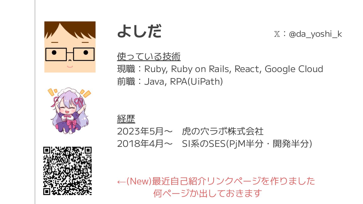 よしだ 𝕏:@da_yoshi_k 使っている技術 現職:Ruby, Ruby on Rails, React, Google Cloud