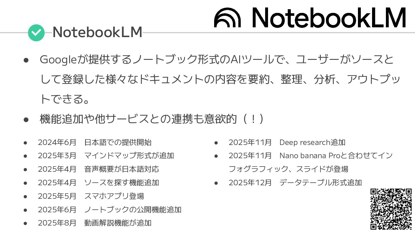 2025年3月 マインドマップ形式が追加 • 2025年4月 音声概要が日本語対応 • 2025年4月 ソースを探す機能追加 • 2025年5月 スマホアプリ登場 • 2025年6月 ノートブックの公開機能追加 • 2025年8月 動画解説機能が追加 • 2025年11月 Deep research追加 • 2025年11月 Nano banana Proと合わせてイン フォグラフィック、スライドが登場 • 2025年12月 データテーブル形式追加