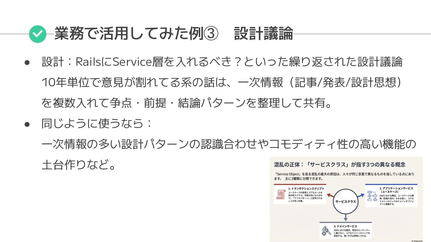 業務で活用してみた例③ 設計議論 • 設計:RailsにService層を入れるべき?といった繰り返された設計議論 10年単位で意見が割れてる系の話は、一次情報(記事/発表/設計思想) を複数入れて争点・前提・結論パターンを整理して共有。 • 同じように使うなら: 一次情報の多い設計パターンの認識合わせやコモディティ性の高い機能の 土台作りなど。