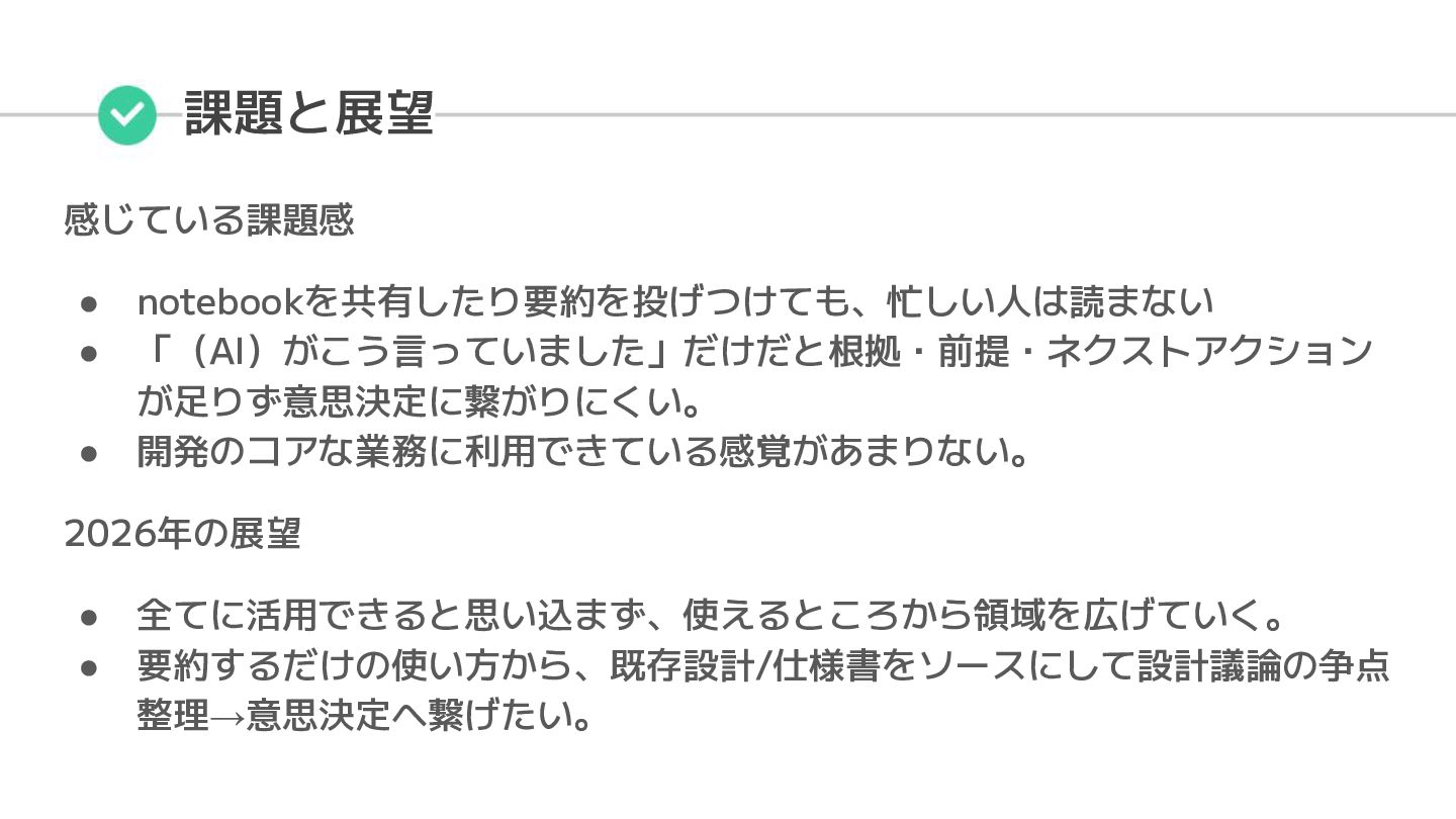 感じている課題感 • notebookを共有したり要約を投げつけても、忙しい人は読まない • 「(AI)がこう言っていました」だけだと根拠・前提・ネクストアクション が足りず意思決定に繋がりにくい。 • 開発のコアな業務に利用できている感覚があまりない。 2026年の展望 •