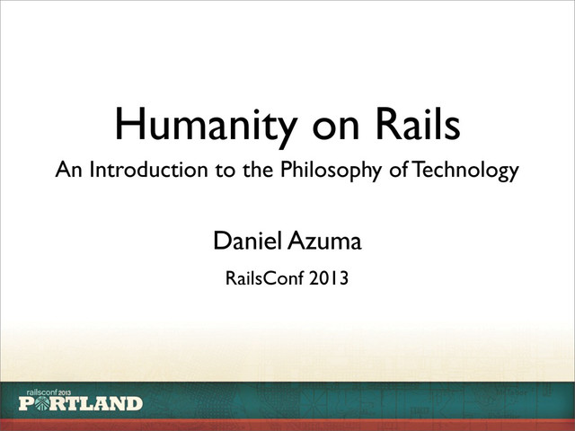 Presentation by Daniel Azuma at RailsConf 2013. An introduction to the philosophy of technology, and a discussion of why it's relevant to the Rails community. For more information, see http://daniel-azuma.com/railsconf2013