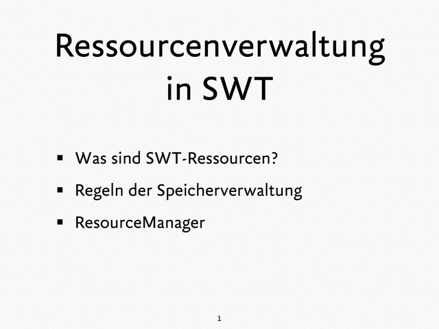 ▪ Beispiel: ▪ dispose() nicht aufrufen, falls Ressource einem anderen Objekt “gehört” Font font = new Font(display, "Arial", 10, SWT.NORMAL); // // ... use font here ... // font.dispose(); Regel #2: “Disposing the parent disposes the children” ▪ Beispiel: widget.dispose() gibt (wie intuitiv erwartet) auch die von widget verwendeten Ressourcen frei