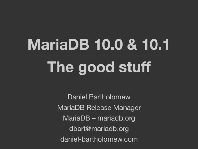 Built on MariaDB 5.5 • Includes crossported & reimplemented features from MySQL 5.6 • Many new features – https://mariadb.com/kb/en/what-is-mariadb-100/