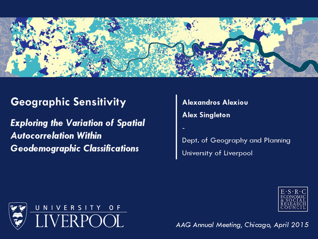 This research generalises results regarding Geographic Sensitivity of socio-spatial patterns (presented earlier in GISRUK 2015) by examining the degree of homogeneity of England's neighbourhoods to national standards. Presented at the Association of American Geographers Annual Meeting in Chicago, April 2015.