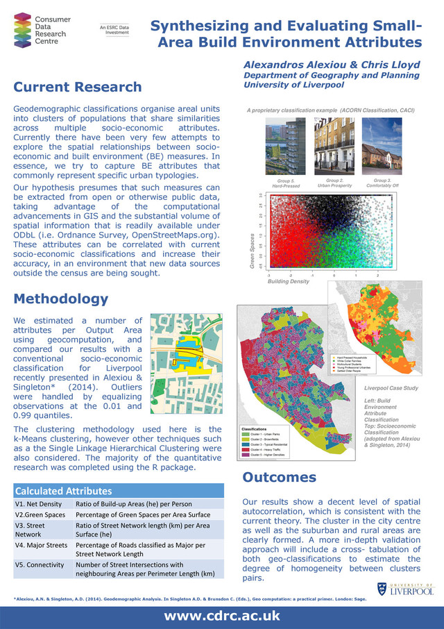 Geodemographic classifications organise areal units into clusters of populations that share similarities across multiple socio-economic attributes. Currently there have been very few attempts to explore the spatial relationships between socio- economic and built environment (BE) measures. In essence, we try to capture BE attributes that commonly represent specific urban typologies. Our hypothesis presumes that such measures can be extracted from open or otherwise public data, taking advantage of the computational advancements in GIS and the substantial volume of spatial information that is readily available under ODbL (i.e. Ordnance Survey, OpenStreetMaps.org). These attributes can be correlated with current socio-economic classifications and increase their accuracy, in an environment that new data sources outside the census are being sought. Alexandros Alexiou & Chris Lloyd Department of Geography and Planning University of Liverpool www.cdrc.ac.uk Methodology We estimated a number of attributes per Output Area using geocomputation, and compared our results with a conventional socio-economic classification for Liverpool recently presented in Alexiou & Singleton* (2014). Outliers were handled by equalizing observations at the 0.01 and 0.99 quantiles. Calculated Attributes V1. Net Density Ratio of Build-up Areas (he) per Person V2.Green Spaces Percentage of Green Spaces per Area Surface V3. Street Network Ratio of Street Network length (km) per Area Surface (he) V4. Major Streets Percentage of Roads classified as Major per Street Network Length V5. Connectivity Number of Street Intersections with neighbouring Areas per Perimeter Length (km) Group 2. Urban Prosperity Group 3. Comfortably Off Group 5. Hard-Pressed A proprietary classification example (ACORN Classification, CACI) The clustering methodology used here is the k-Means clustering, however other techniques such as a the Single Linkage Hierarchical Clustering were also considered. The majority of the quantitative research was completed using the R package. Outcomes Our results show a decent level of spatial autocorrelation, which is consistent with the current theory. The cluster in the city centre as well as the suburban and rural areas are clearly formed. A more in-depth validation approach will include a cross- tabulation of both geo-classifications to estimate the degree of homogeneity between clusters pairs. Liverpool Case Study Left: Build Environment Attribute Classification Top: Socioeconomic Classification (adopted from Alexiou & Singleton, 2014) Green Spaces Building Density *Alexiou, A.N. & Singleton, A.D. (2014). Geodemographic Analysis. In Singleton A.D. & Brunsdon C. (Eds.), Geo computation: a practical primer. London: Sage.