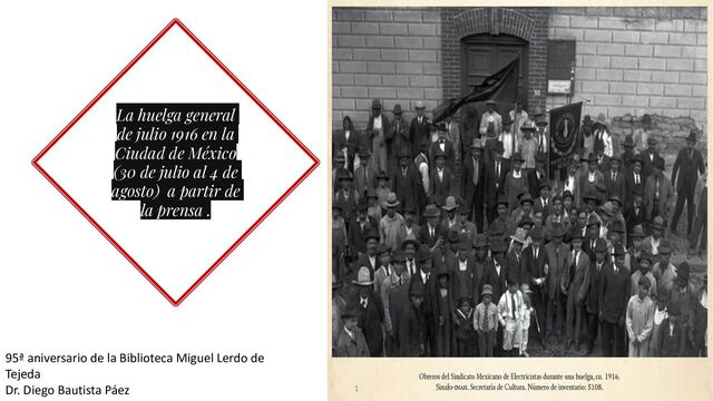 La huelga general de 1916 a partir de la prensa, ponencia presentada dentro del ciclo Caleidoscopio de una época por el 95 aniversario de la Biblioteca Miguel Lerdo de Tejada, miércoles 05 de abril de 2023.