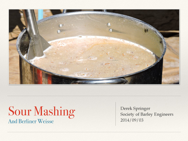 sour beer (my Berliner Weisse is only two weeks old).! ❖ Don’t need a separate set of sour equipment.! ❖ Easily control how sour your final product will be.! ❖ A way to add nuance to classically “clean” beers or controlled funk to farmhouse styles.! ❖ Your final beer can be “clean.” Pros ❖ Not difficult to create foul tasting and smelling wort.! ❖ No chance for nuance from long-term sour process w/ multiple critters.! ❖ Potentially introducing “bad” bugs into your brew space.! ❖ Wort pH < 3.3 interferes with Saccharomyces fermentation. Cons