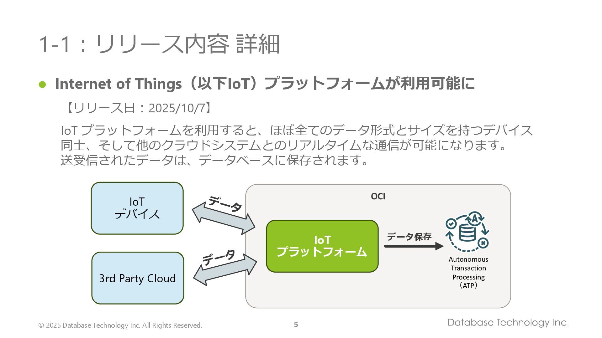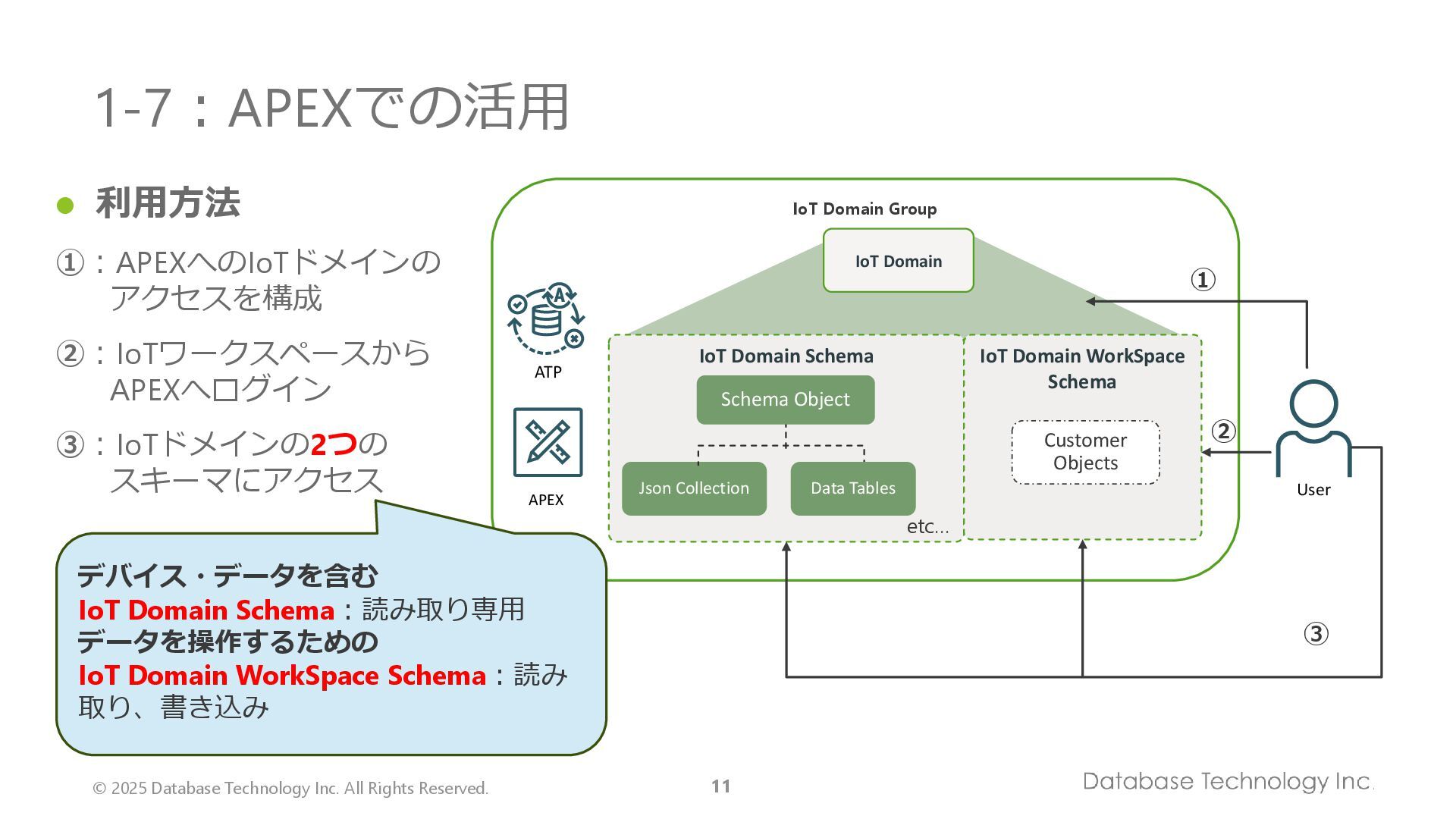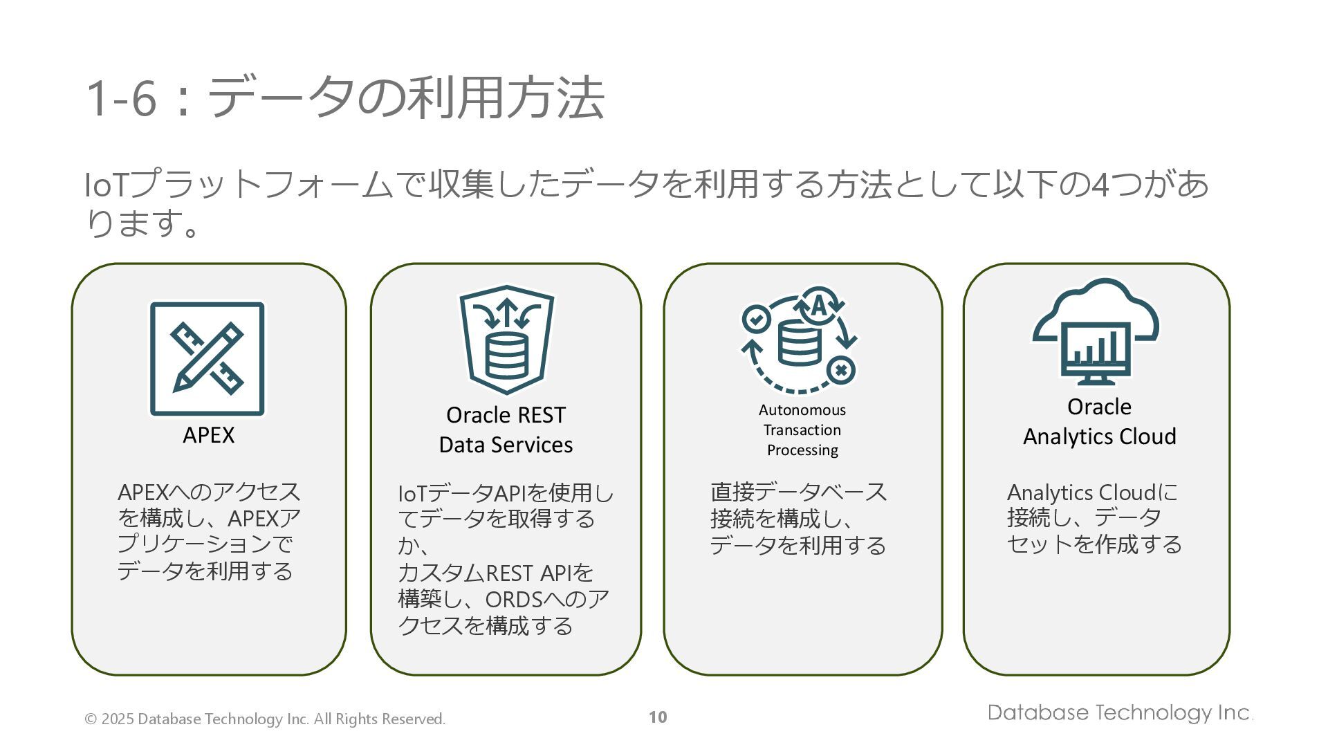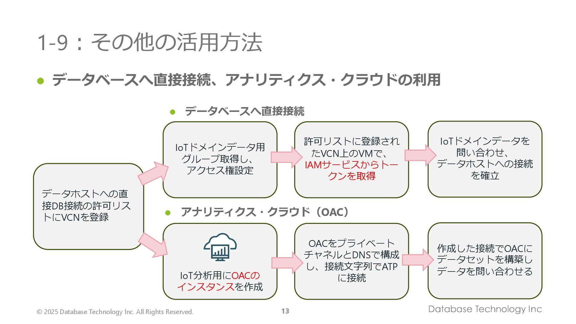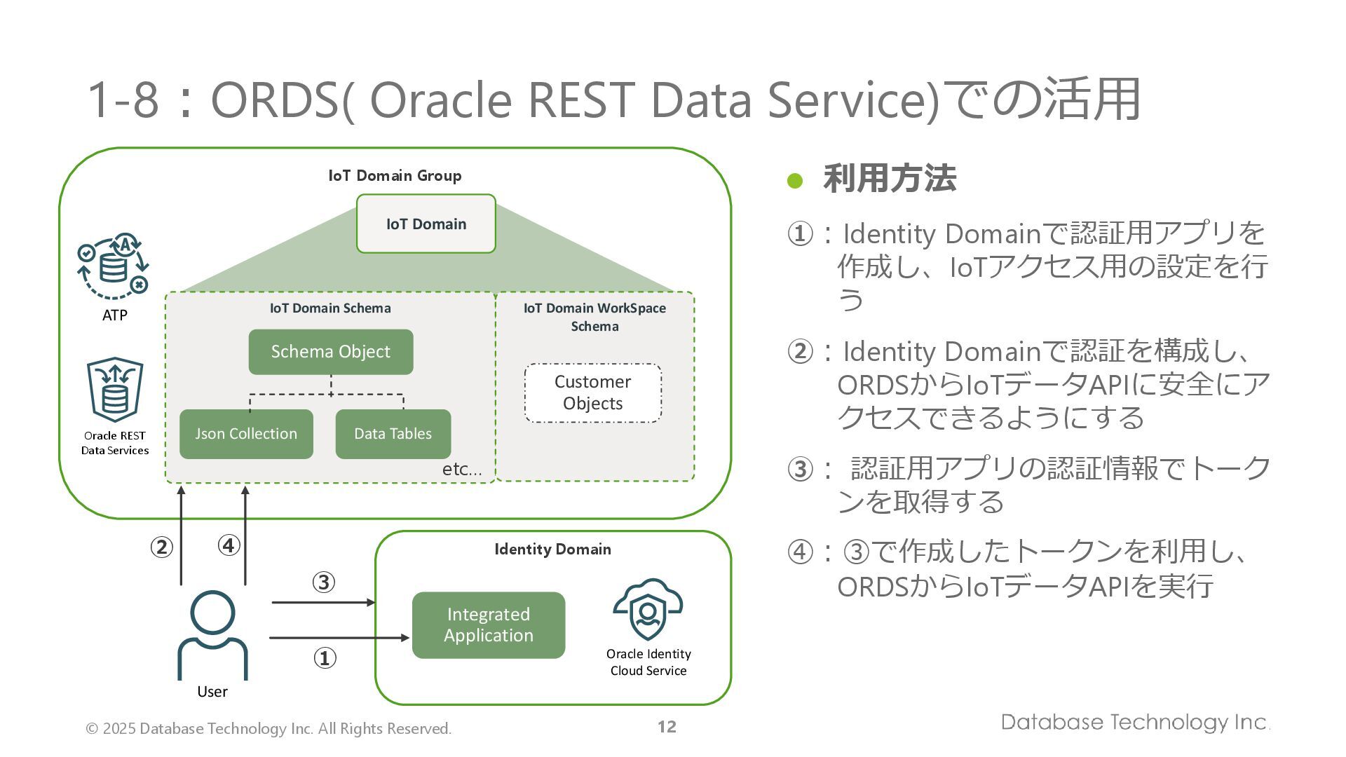 Oracle REST Data Service)での活用 IoT Domain Group ATP IoT Domain Schema Json Collection Schema Object IoT Domain Data Tables IoT Domain WorkSpace Schema etc… Customer Objects User Oracle REST Data Services Identity Domain Oracle Identity Cloud Service Integrated Application ⚫ 利用方法 ①:Identity Domainで認証用アプリを 作成し、IoTアクセス用の設定を行 う ②:Identity Domainで認証を構成し、 ORDSからIoTデータAPIに安全にア クセスできるようにする ③: 認証用アプリの認証情報でトーク ンを取得する ④:③で作成したトークンを利用し、 ORDSからIoTデータAPIを実行 ④ ① ③ ②