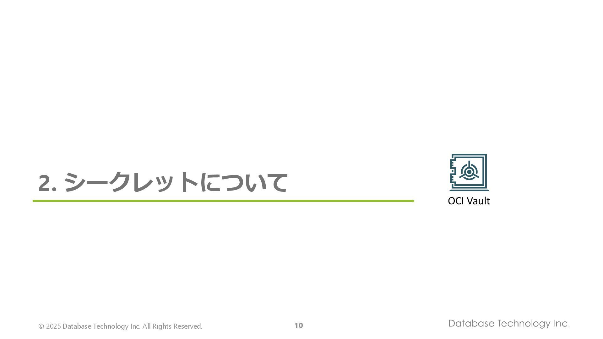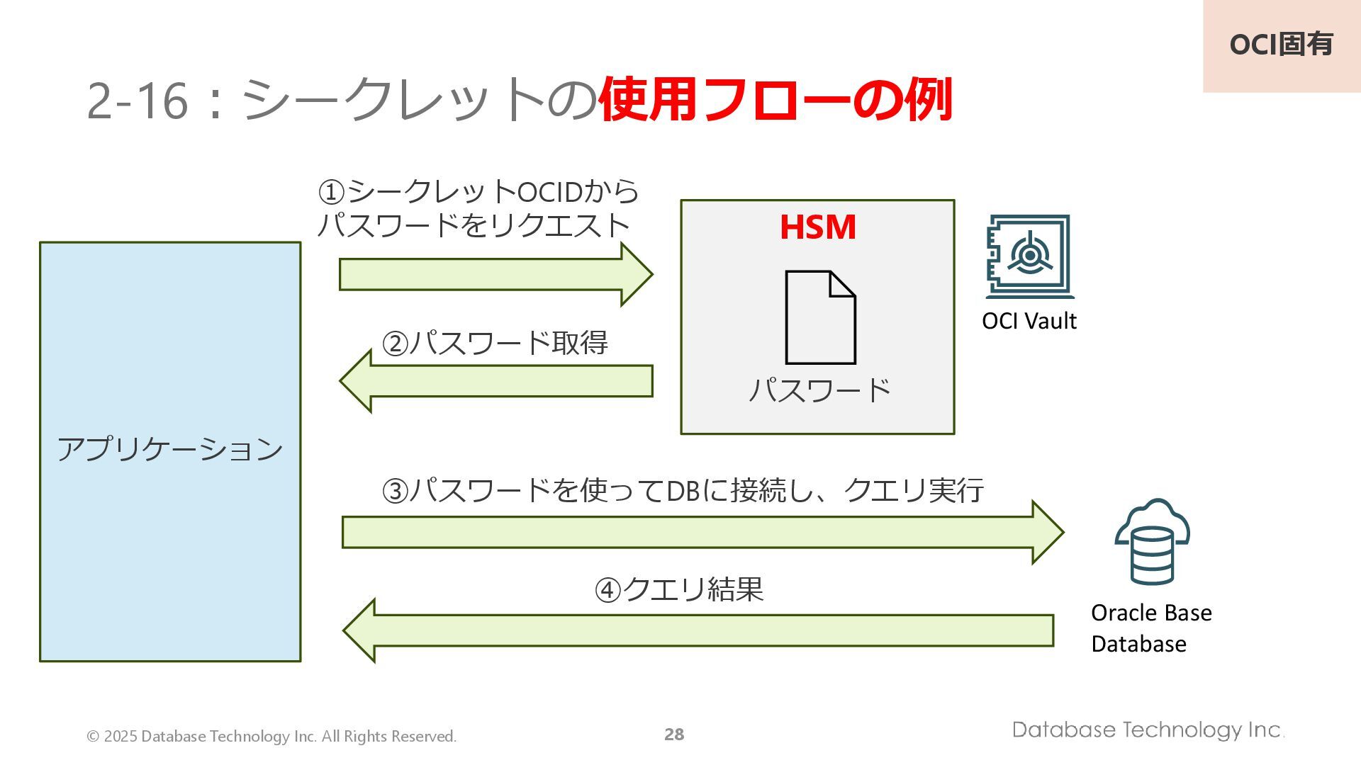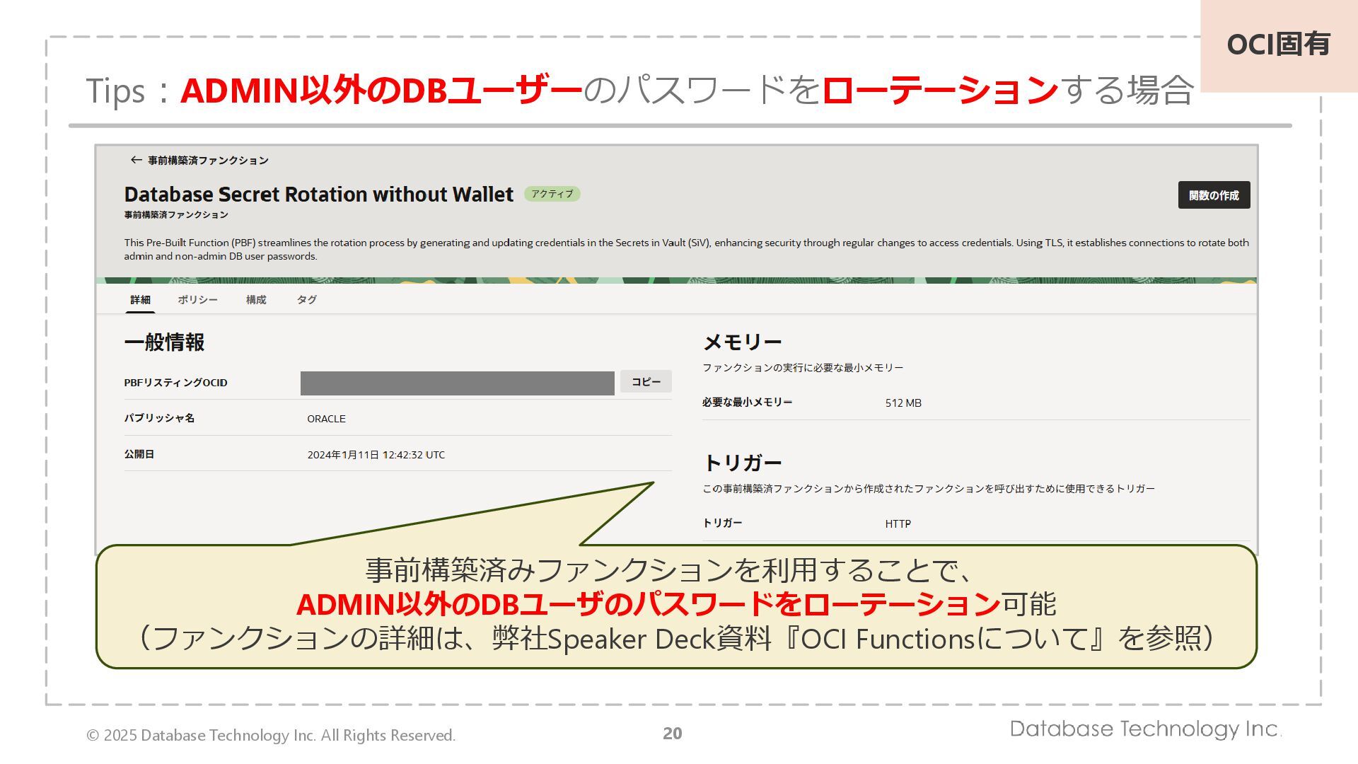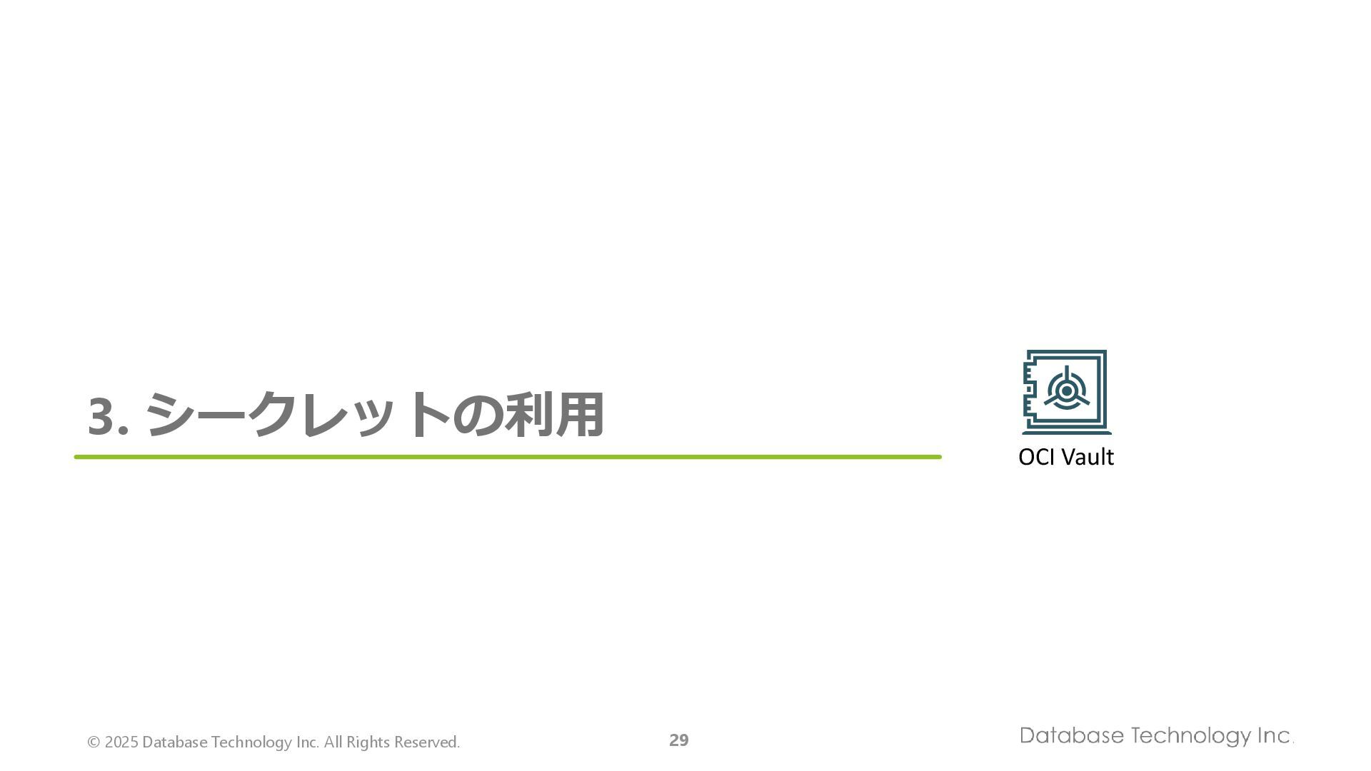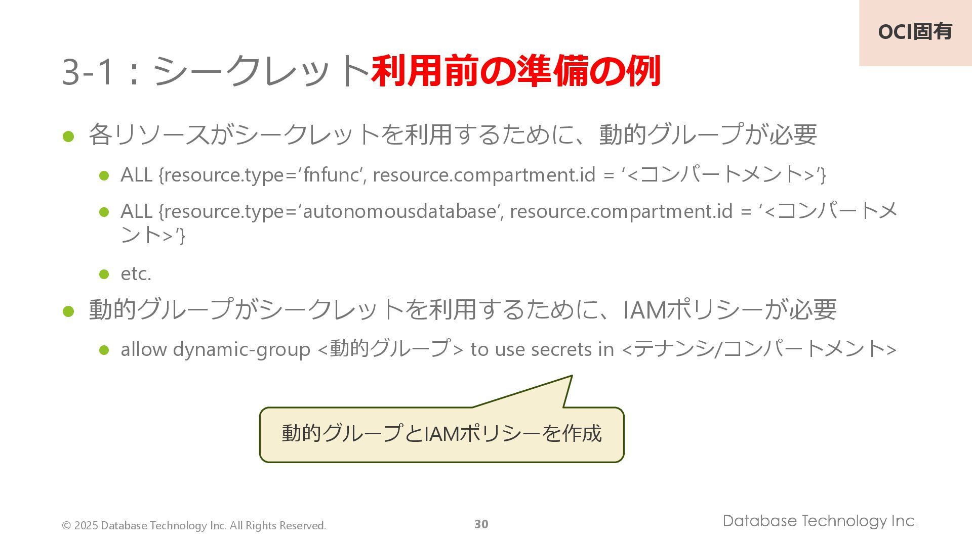 ⚫ 各リソースがシークレットを利用するために、動的グループが必要 ⚫ ALL {resource.type=‘fnfunc’, resource.compartment.id = ‘<コンパートメント>’} ⚫ ALL {resource.type=‘autonomousdatabase’, resource.compartment.id = ‘<コンパートメ ント>’} ⚫ etc. ⚫ 動的グループがシークレットを利用するために、IAMポリシーが必要 ⚫ allow dynamic-group <動的グループ> to use secrets in <テナンシ/コンパートメント> 動的グループとIAMポリシーを作成 OCI固有