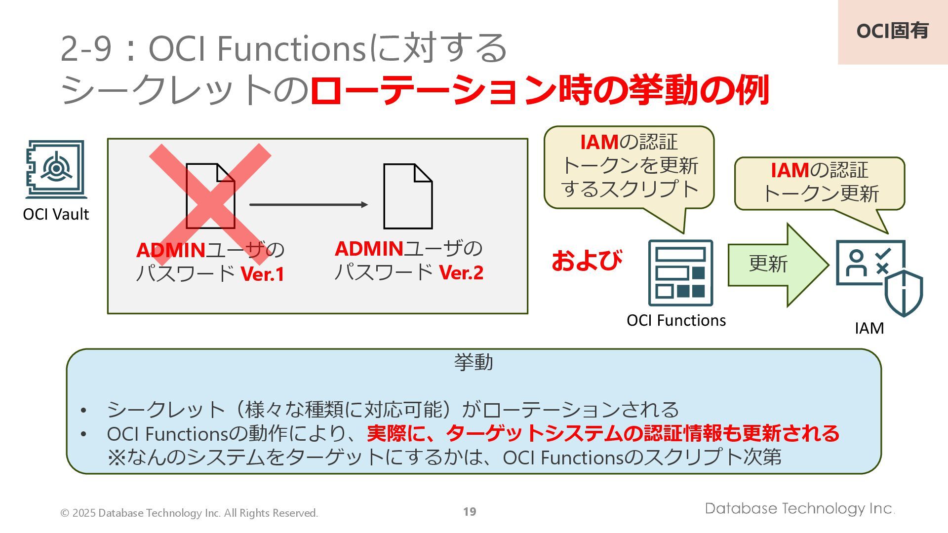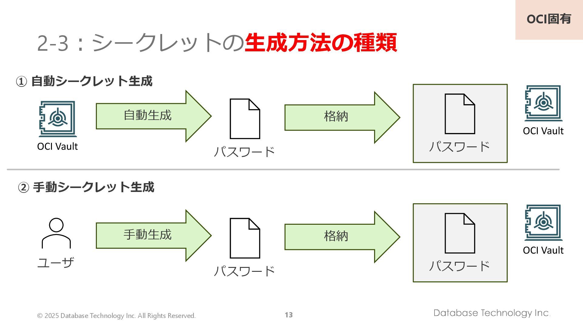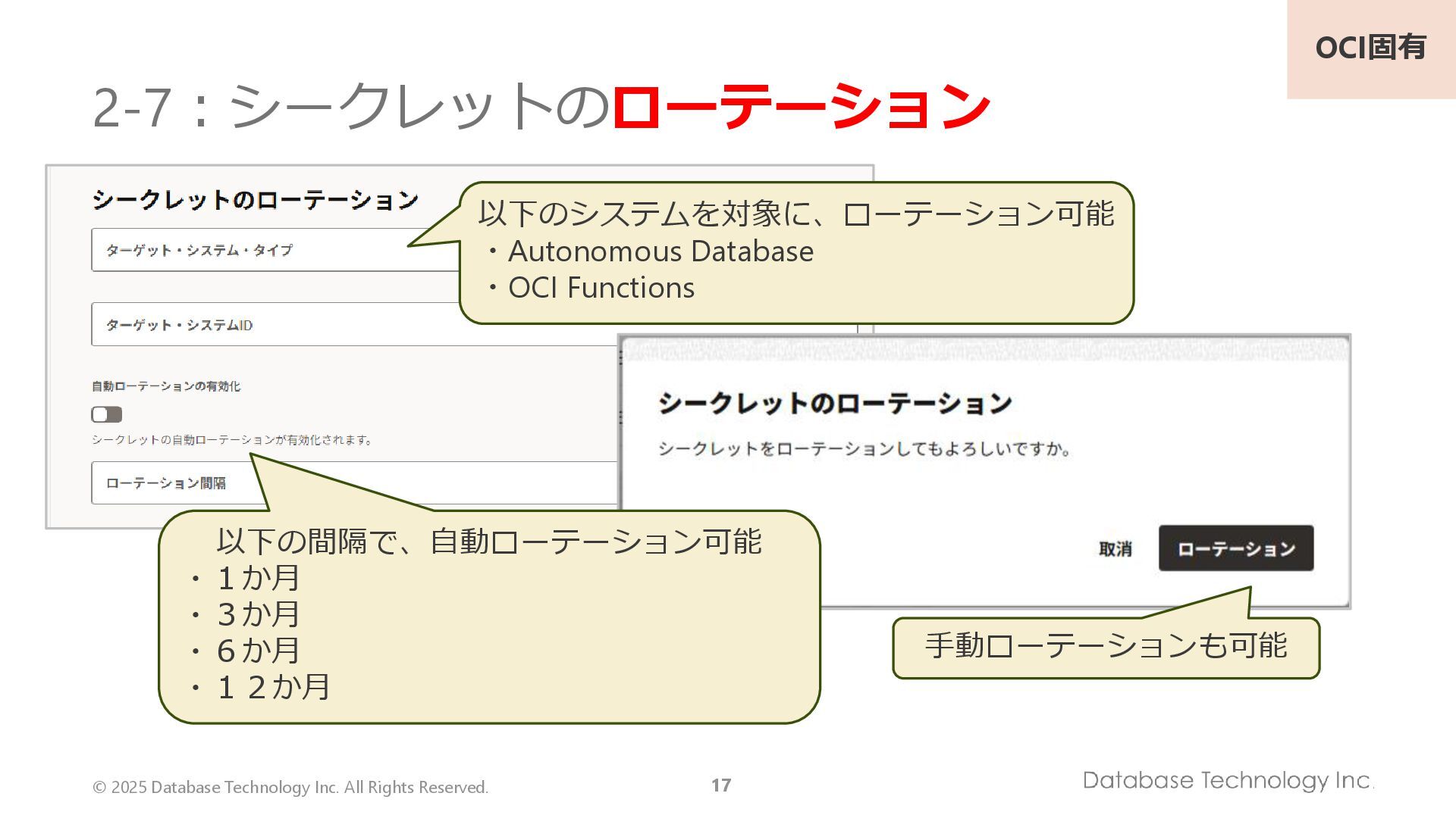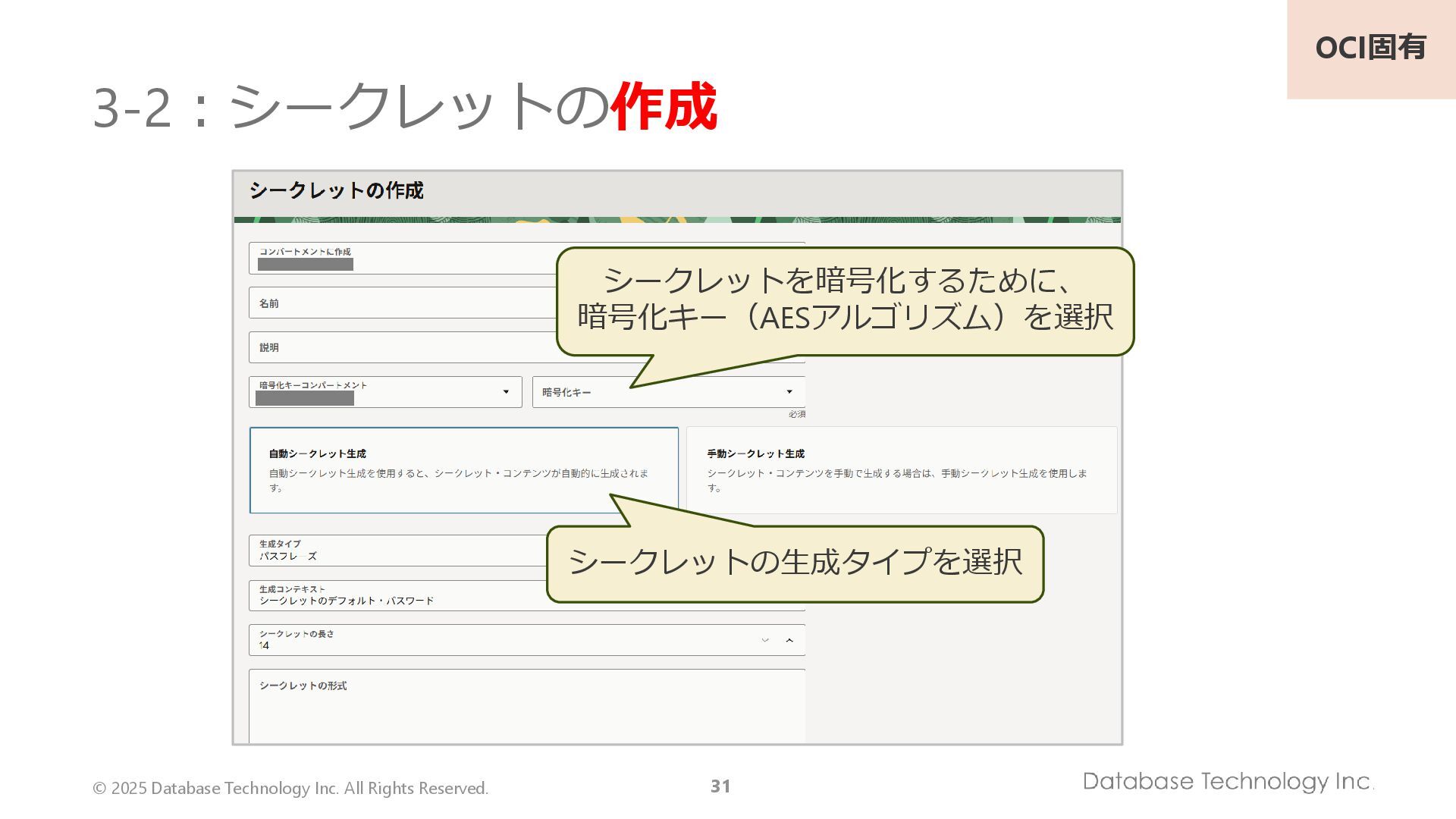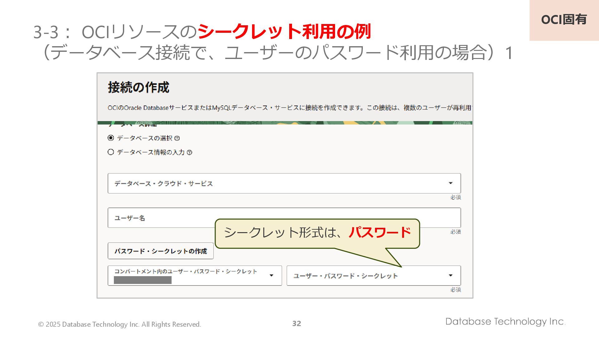 ⚫ 各リソースがシークレットを利用するために、動的グループが必要 ⚫ ALL {resource.type=‘fnfunc’, resource.compartment.id = ‘<コンパートメント>’} ⚫ ALL {resource.type=‘autonomousdatabase’, resource.compartment.id = ‘<コンパートメ ント>’} ⚫ etc. ⚫ 動的グループがシークレットを利用するために、IAMポリシーが必要 ⚫ allow dynamic-group <動的グループ> to use secrets in <テナンシ/コンパートメント> 動的グループとIAMポリシーを作成 OCI固有