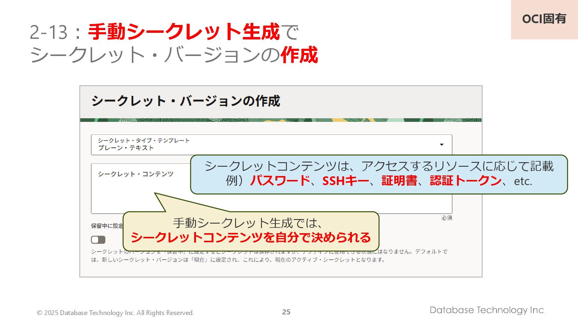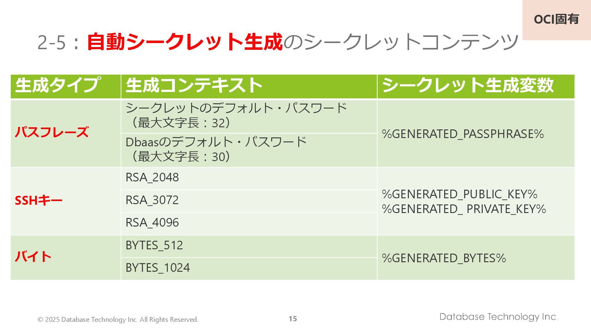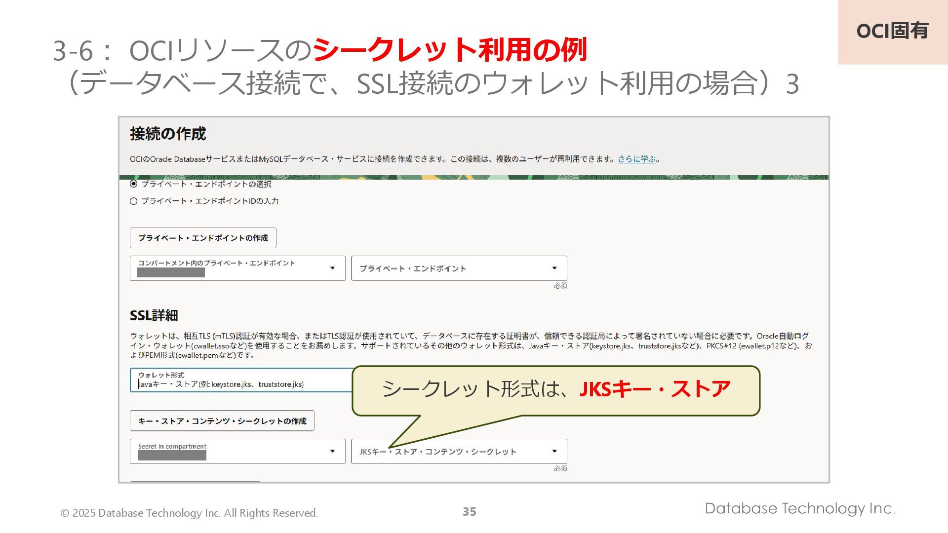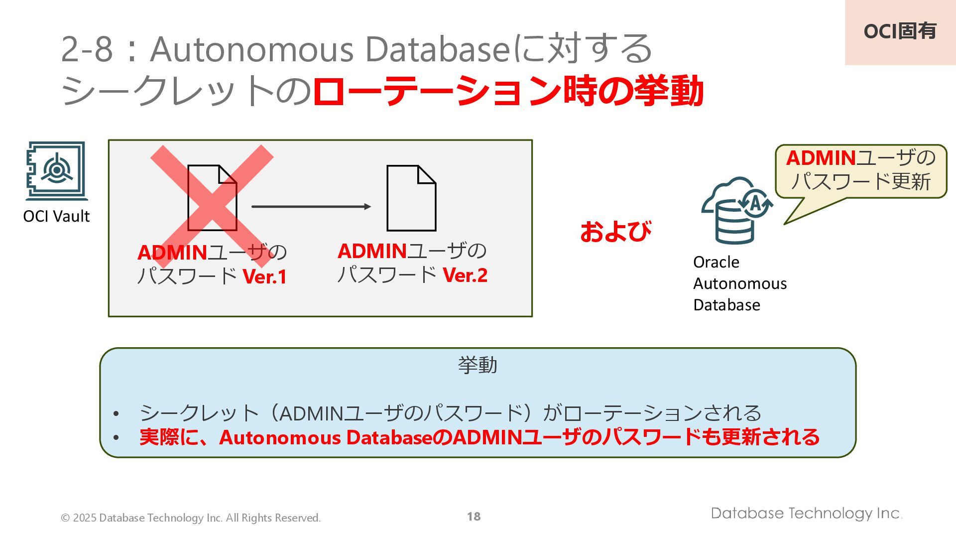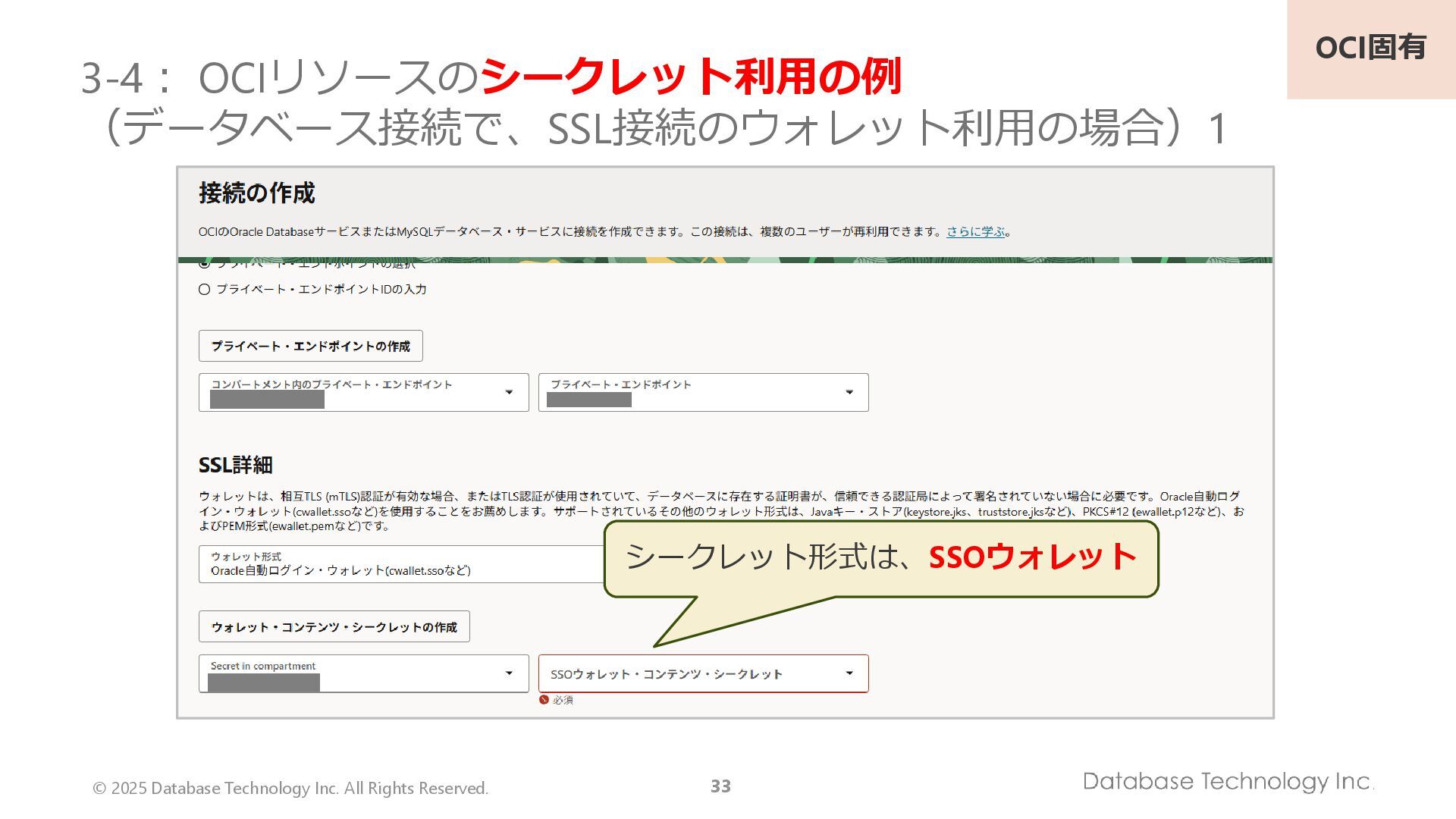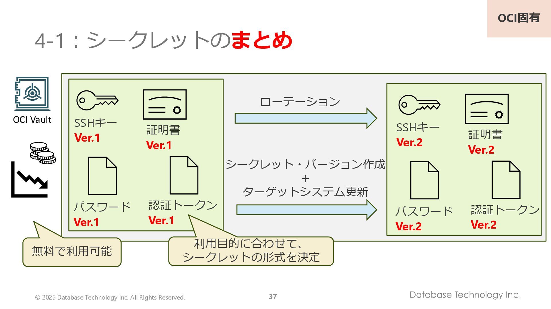 ⚫ 各リソースがシークレットを利用するために、動的グループが必要 ⚫ ALL {resource.type=‘fnfunc’, resource.compartment.id = ‘<コンパートメント>’} ⚫ ALL {resource.type=‘autonomousdatabase’, resource.compartment.id = ‘<コンパートメ ント>’} ⚫ etc. ⚫ 動的グループがシークレットを利用するために、IAMポリシーが必要 ⚫ allow dynamic-group <動的グループ> to use secrets in <テナンシ/コンパートメント> 動的グループとIAMポリシーを作成 OCI固有