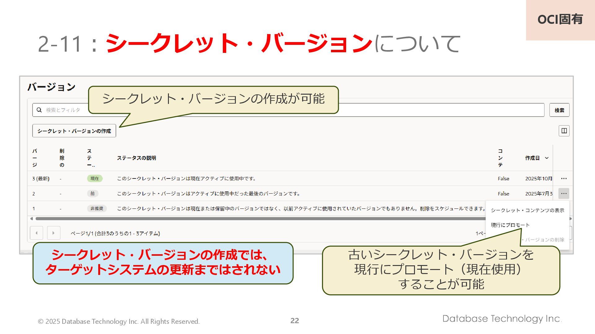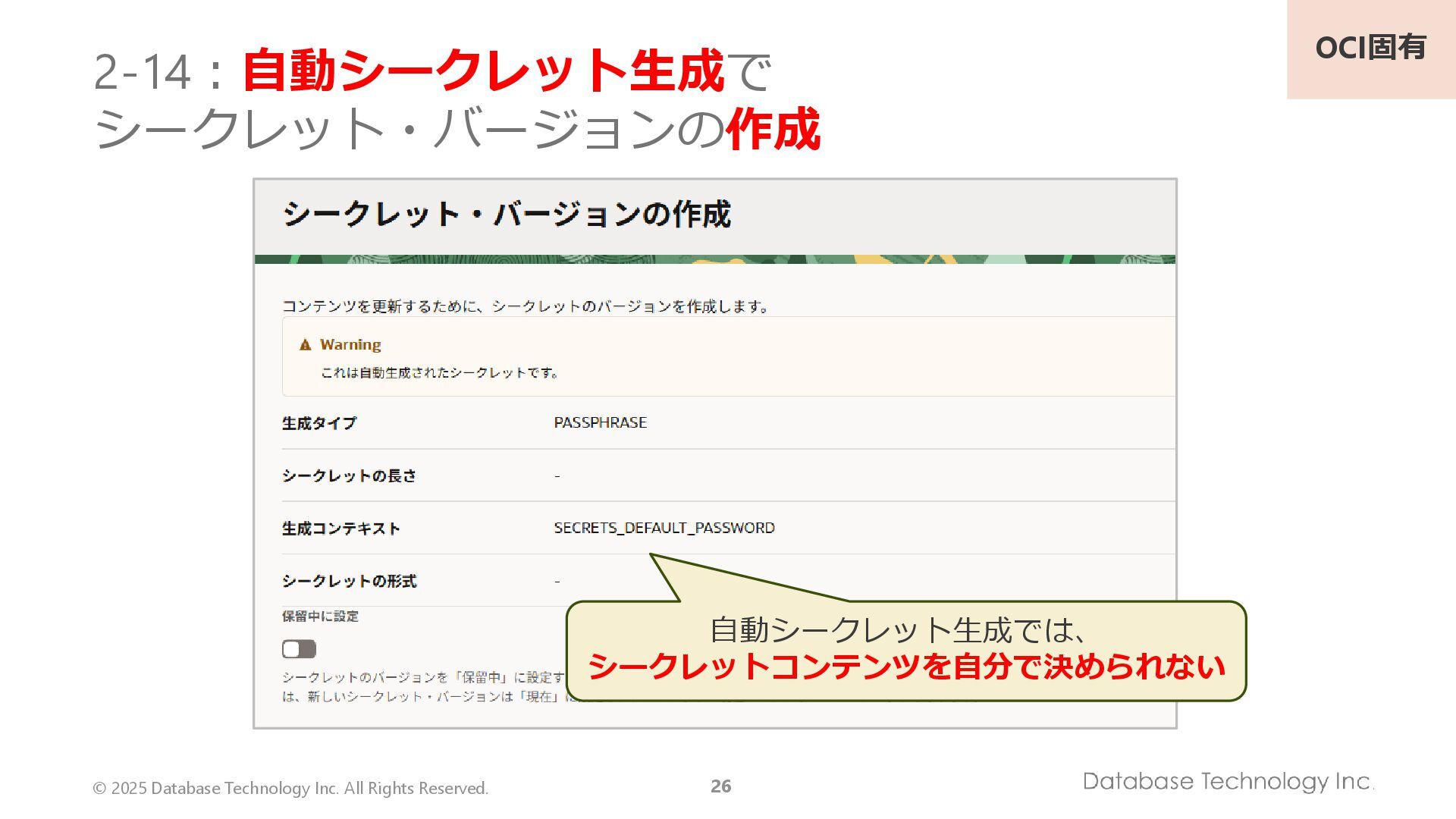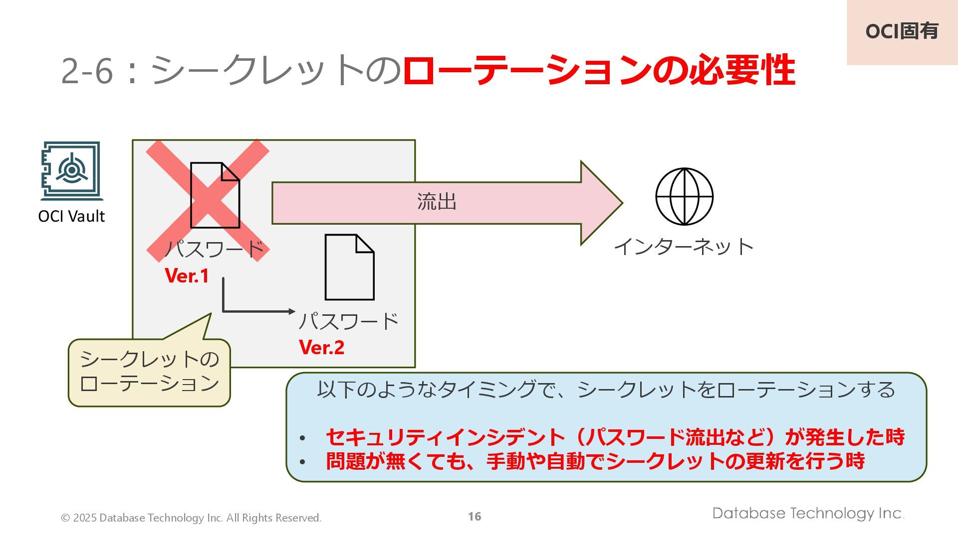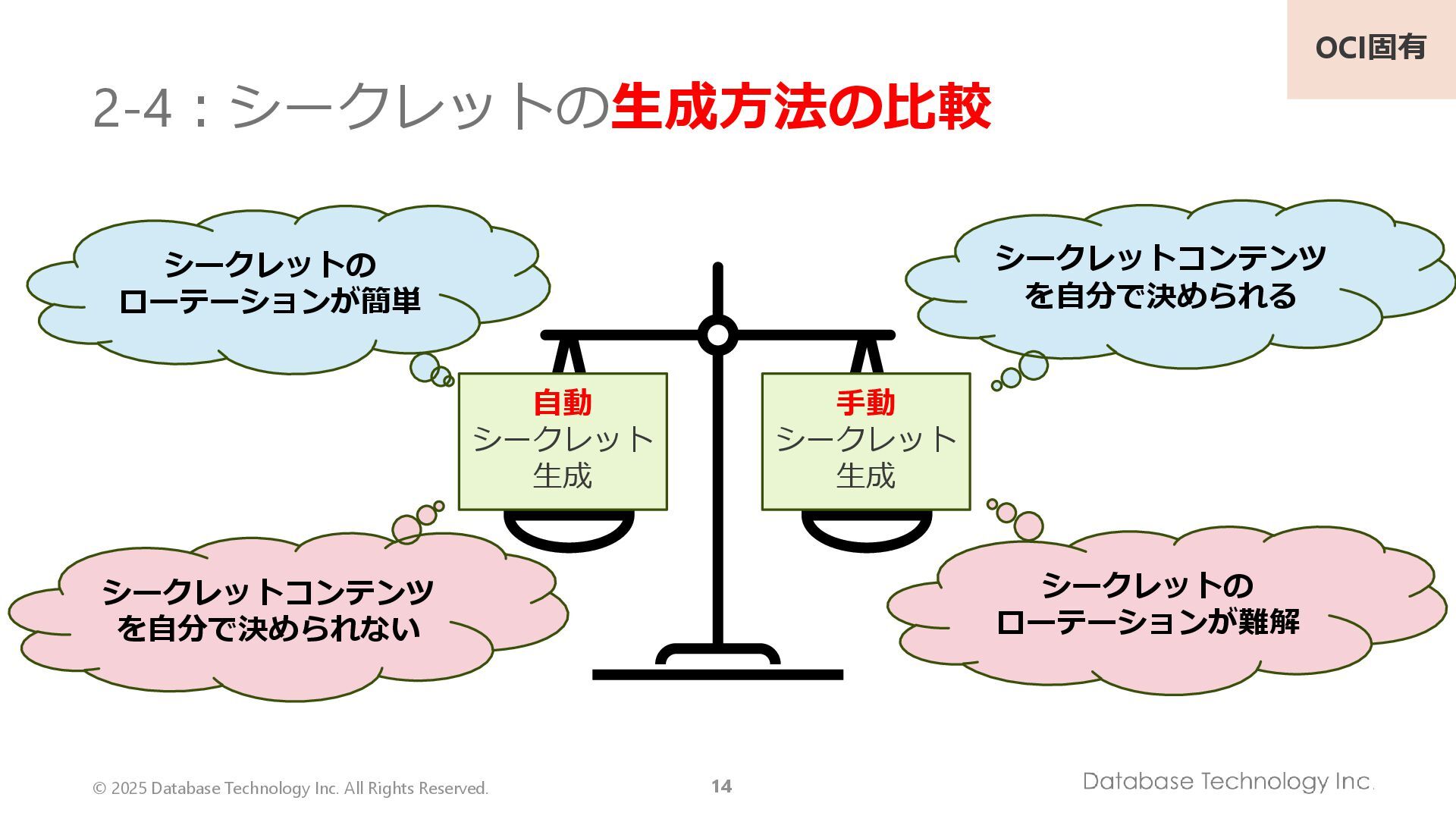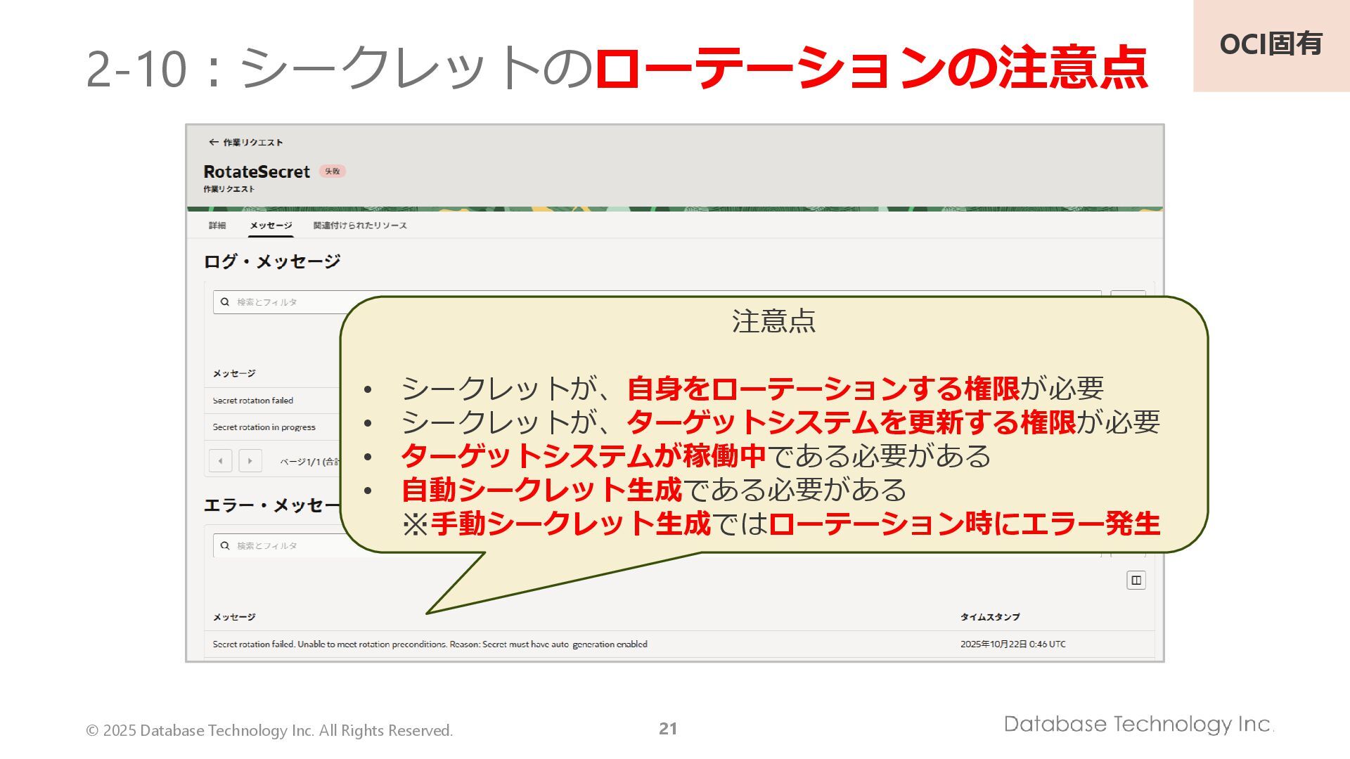 ⚫ 各リソースがシークレットを利用するために、動的グループが必要 ⚫ ALL {resource.type=‘fnfunc’, resource.compartment.id = ‘<コンパートメント>’} ⚫ ALL {resource.type=‘autonomousdatabase’, resource.compartment.id = ‘<コンパートメ ント>’} ⚫ etc. ⚫ 動的グループがシークレットを利用するために、IAMポリシーが必要 ⚫ allow dynamic-group <動的グループ> to use secrets in <テナンシ/コンパートメント> 動的グループとIAMポリシーを作成 OCI固有