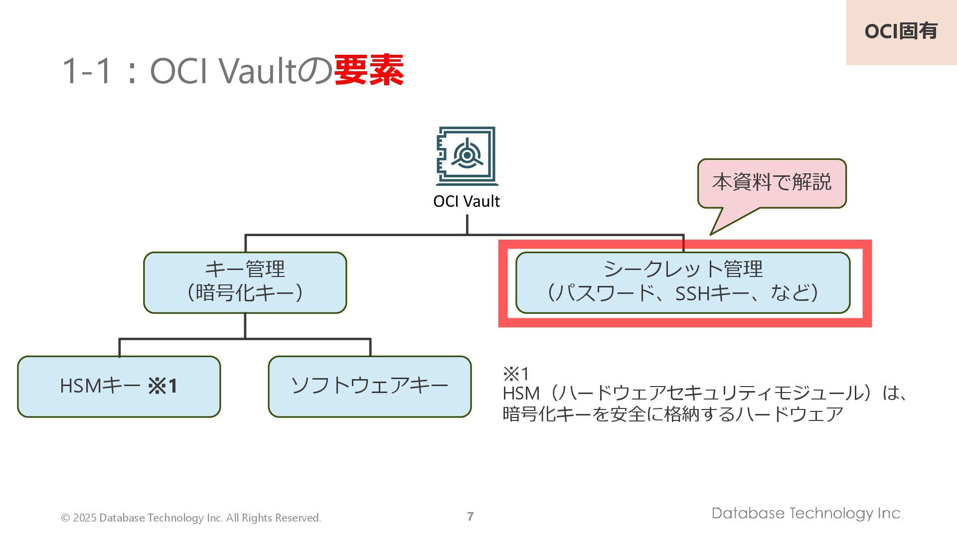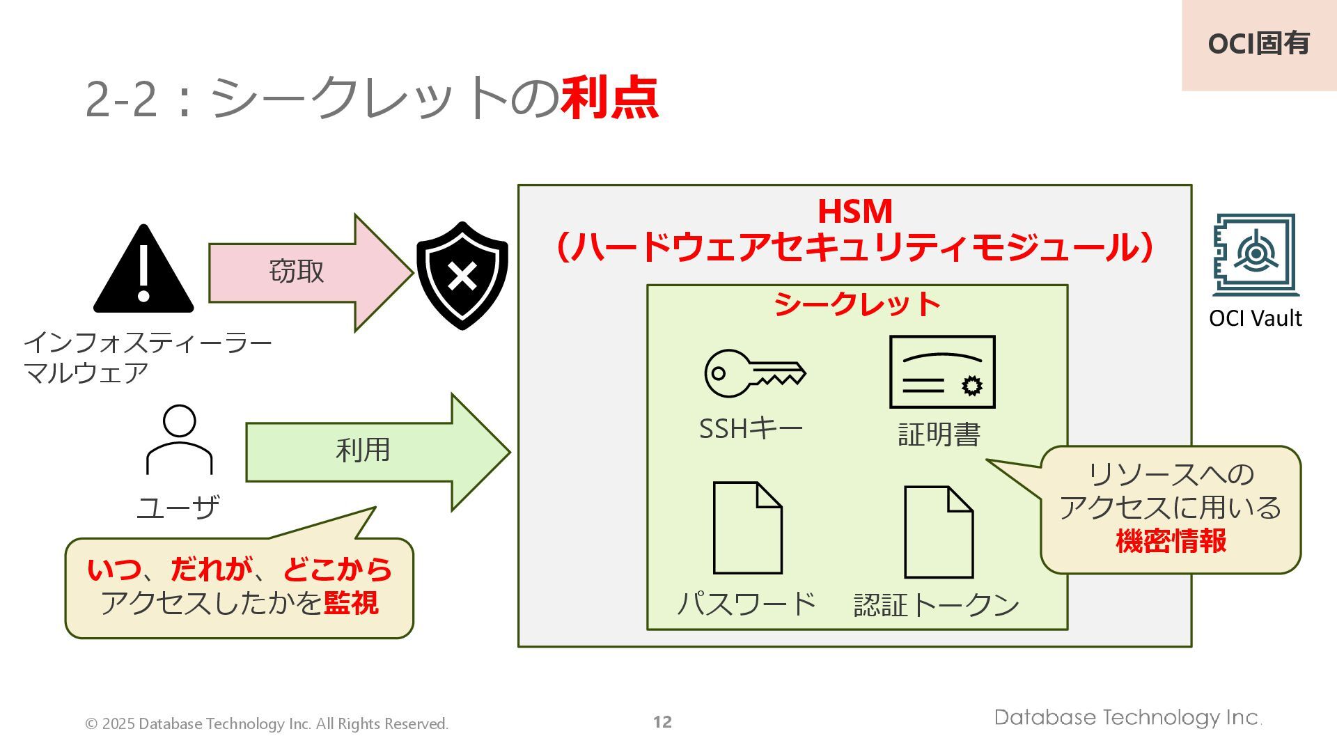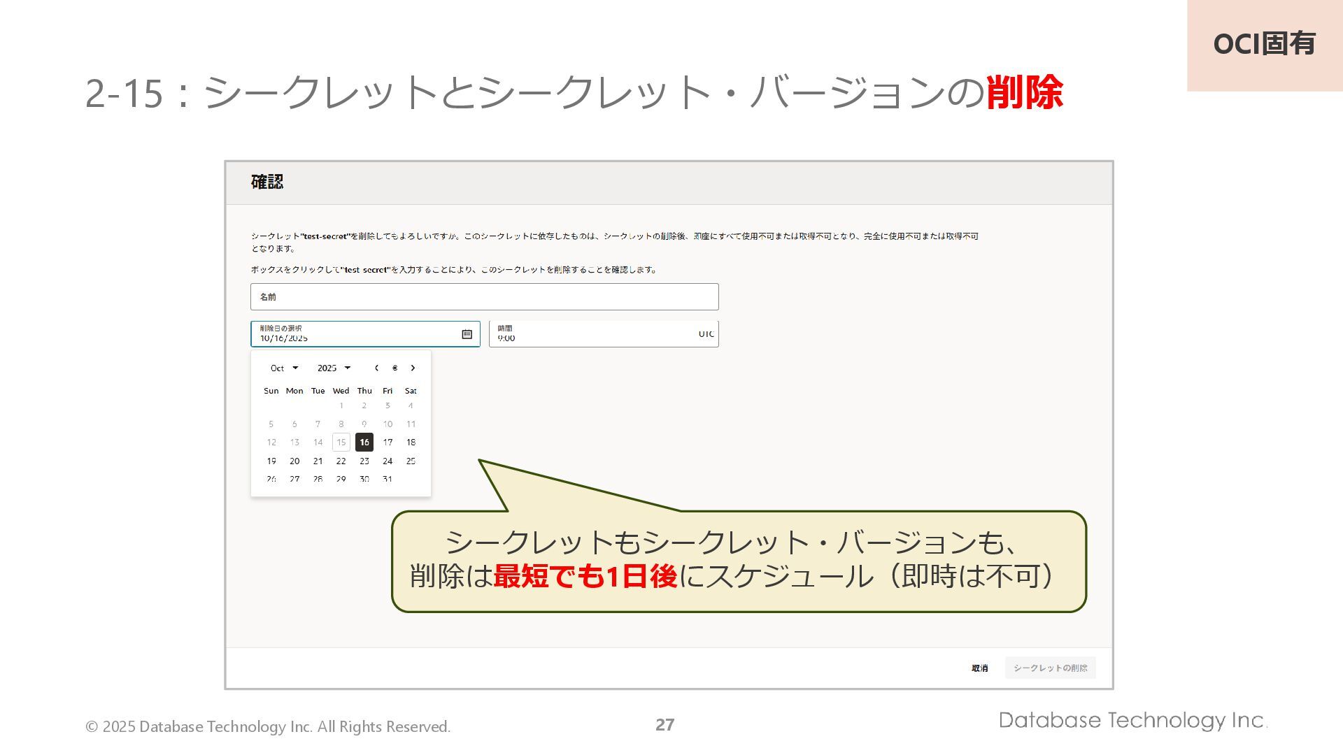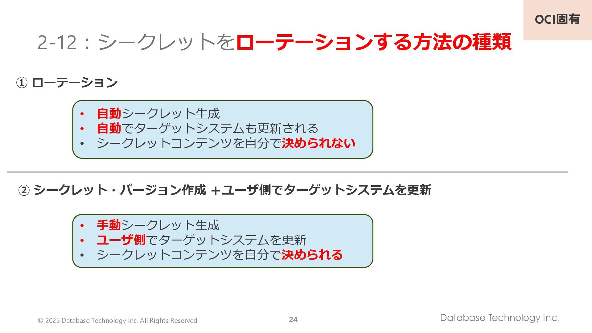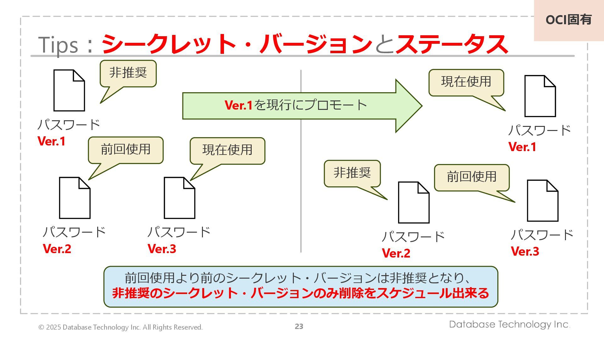 ⚫ 各リソースがシークレットを利用するために、動的グループが必要 ⚫ ALL {resource.type=‘fnfunc’, resource.compartment.id = ‘<コンパートメント>’} ⚫ ALL {resource.type=‘autonomousdatabase’, resource.compartment.id = ‘<コンパートメ ント>’} ⚫ etc. ⚫ 動的グループがシークレットを利用するために、IAMポリシーが必要 ⚫ allow dynamic-group <動的グループ> to use secrets in <テナンシ/コンパートメント> 動的グループとIAMポリシーを作成 OCI固有