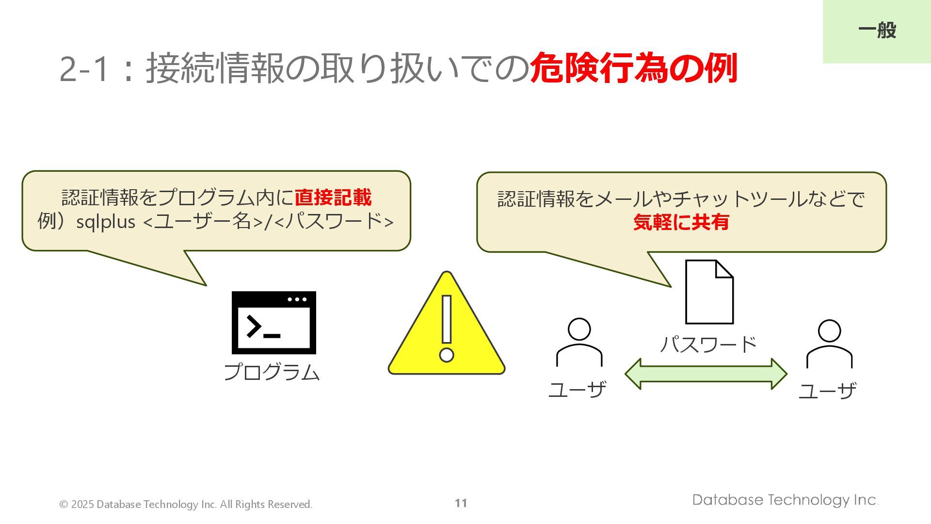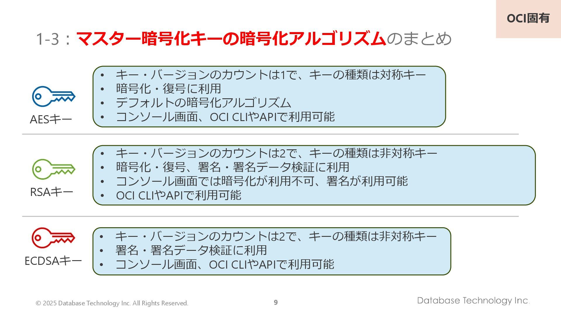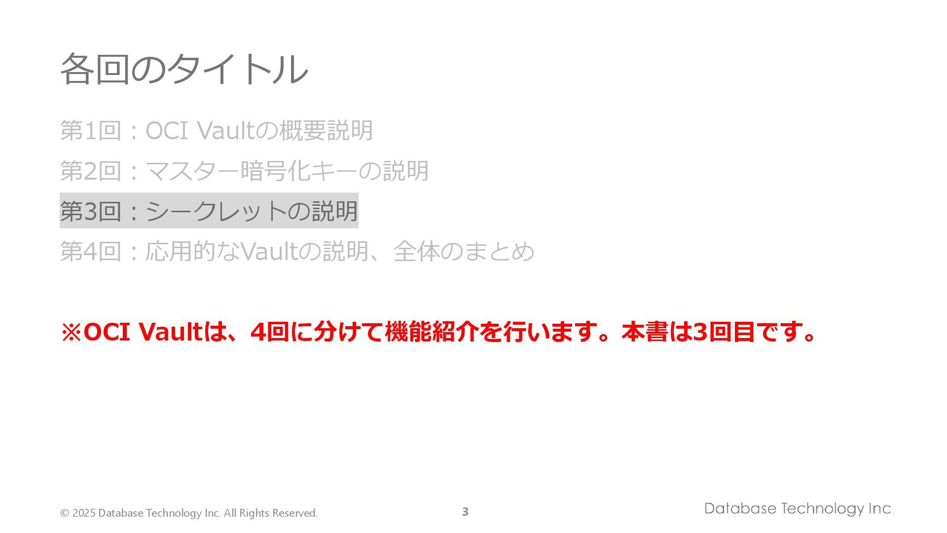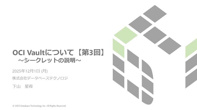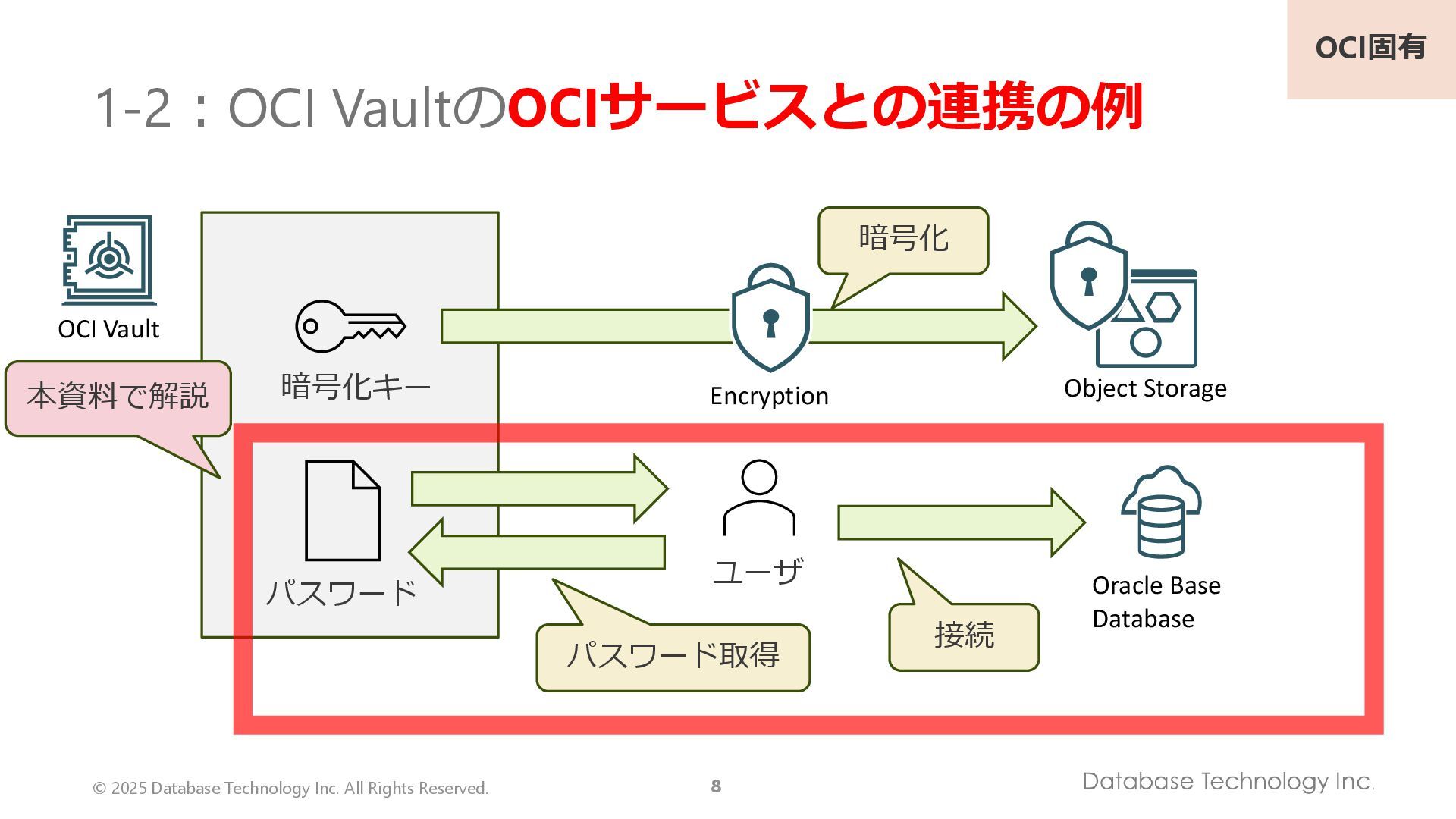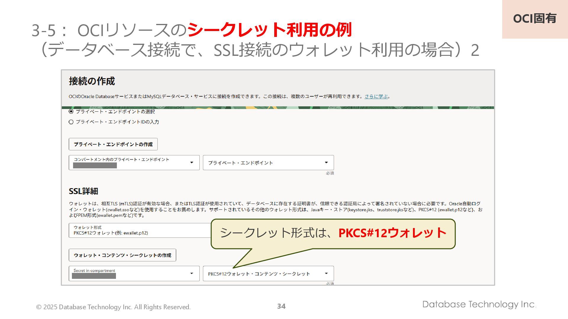 ⚫ 各リソースがシークレットを利用するために、動的グループが必要 ⚫ ALL {resource.type=‘fnfunc’, resource.compartment.id = ‘<コンパートメント>’} ⚫ ALL {resource.type=‘autonomousdatabase’, resource.compartment.id = ‘<コンパートメ ント>’} ⚫ etc. ⚫ 動的グループがシークレットを利用するために、IAMポリシーが必要 ⚫ allow dynamic-group <動的グループ> to use secrets in <テナンシ/コンパートメント> 動的グループとIAMポリシーを作成 OCI固有