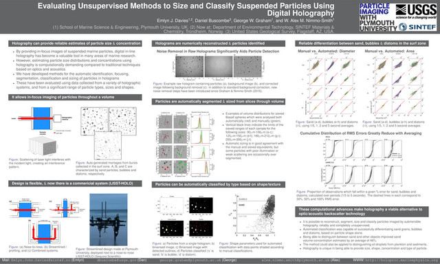 Digital Holography Emlyn J. Davies1,2, Daniel Buscombe3, George W. Graham1, and W. Alex M. Nimmo-Smith1 (1) School of Marine Science & Engineering, Plymouth University, UK. (2) Now at: Department of Environmental Technology, SINTEF Materials & Chemistry, Trondheim, Norway. (3) United States Geological Survey, Flagstaff, AZ, USA. Holography can provide reliable estimates of particle size & concentration ◮ By providing in-focus images of suspended marine particles, digital in-line holography has become a valuable tool in many areas of marine research. ◮ However, estimating particle size distributions and concentrations using holography is computationally demanding compared to traditional techniques based on optics and acoustics. ◮ We have developed methods for the automatic identification, focusing, segmentation, classification and sizing of particles in holograms ◮ These have been evaluated using data collected from a variety of holographic systems, and from a significant range of particle types, sizes and shapes. It allows in-focus imaging of particles throughout a volume Figure: Scattering of laser light interferes with the incident light, creating an interference pattern. Figure: Auto-generated montages from bursts collected in the surf zone. A, B, and C are characterized by sand particles, bubbles and diatoms, respectively. Design is flexible, & now there is a commericial system (LISST-HOLO) Figure: (a) Nose-to-nose, (b) Streamlined / profiling, and (c) Combined systems. Figure: Streamlined design made at Plymouth University, deployed next to a nose-to-nose LISST-HOLO (Sequoia Scientific) Holograms are numerically reconstructed & particles identified Noise Removal in Raw Holograms Significantly Aids Particle Detection Figure: Example raw hologram containing particles (a), background image (b), and corrected image following background removal (c). In addition to standard background correction, new noise removal steps have been introduced since Graham & Nimmo Smith (2010). Particles are automatically segmented & sized from slices through volume ◮ Examples of volume distributions for sieved Basalt spheres which were analysed both automatically (red) and manually (green). ◮ Vertical black lines indicate the limits of the sieved ranges of each sample for the following sizes: 90µm-106µm (a-c); 125µm-150µm (d-f); 180µm-212µm (g-i); 250µm-300µm (j-l). ◮ Automatic sizing is in good agreement with the manual and sieved equivalents, but some particles with poor illumination or weak scattering are occasionally over segmented. Particles can be automatically classified by type based on shape/texture Figure: a) Particles from a single hologram; b) binarised image; c) Binarised image with detected outlines; d) Particles classified (‘s’ is sand; ‘b’ is bubble; ‘d’ is diatom). Figure: Shape parameters used for automated classification with data-points shaded according to manual classifications. Reliable differentiation between sand, bubbles & diatoms in the surf zone Manual vs. Automated: Diameter Figure: Sand (a-d), bubbles (e-h) and diatoms (i-l), using 1/5, 1, 2 and 5 second averages. Manual vs. Automated: Area Figure: Sand (a-d), bubbles (e-h) and diatoms (i-l), using 1/5, 1, 2 and 5 second averages. Cumulative Distribution of RMS Errors Greatly Reduce with Averaging Figure: Proportion of observations which fall within a given % error for sand, bubbles and diatoms, calculated over periods (1/5 to 5 seconds). The dashed lines in each correspond to 30%, 50% and 100% RMS error. These computational advances make holography a viable alternative to optic/acoustic backscatter technology ◮ It is possible to reconstruct, segment, size and classify particles imaged by submersible holography, reliably and completely unsupervised. ◮ Automated classification was capable of successfully differentiating sand grains, bubbles and diatoms, based on particle shape alone. ◮ Being able to distinguish between sand and other objects improved sand volume-concentration estimates by an average of 46%. ◮ The method could also be applied to distinguishing oil droplets from plankton and sediments. ◮ Holography is unique in being able to provide size, shape, concentration and type of particle. Mail: