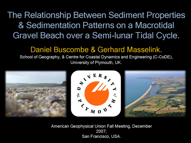 Macrotidal Gravel Beach over a Semi-lunar Tidal Cycle. Daniel Buscombe & Gerhard Masselink. School of Geography, & Centre for Coastal Dynamics and Engineering (C-CoDE), University of Plymouth, UK. American Geophysical Union Fall Meeting, December 2007; San Francisco, USA.