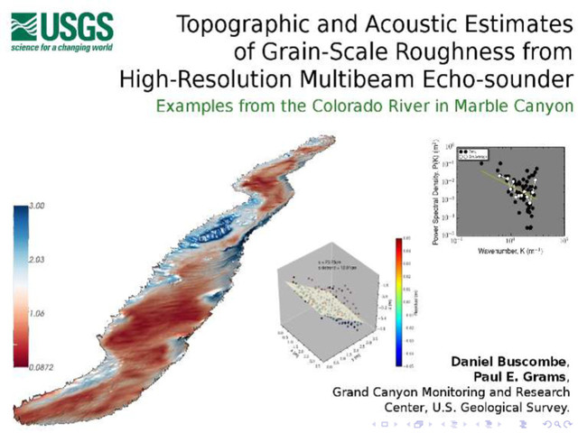 A suite of statistical parameters relate to sediment type ◮ Applicable to both topography and backscatter ◮ Lots of options for acoustic bed sediment classification ◮ Relative proportions of sand and gravel in mixtures? ◮ How would this change with silt/clay, or vegetated bottoms ? Sandy gravels in Glen Canyon, Dec 2014