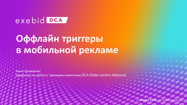 programmatic-решений для предельной эффективности Demand Side Platform DSP Exebid.DCA агрегирует запросы рекламодателей на показы рекламы различ- ных товаров. Data Management Platform Собственная DMP Facetz.DCA сообщает DSP, какие пользо- ватели скорее всего заинтере- суются рекламой данных товаров. Sell Side Platform SSP Spicy.DCA ищет свободные места на сайтах, которые посещают люди из нуж- ных целевых групп прямо сейчас, и выкупает размещение для бренда по самой выгодной цене. Рекламодатель. DSP DMP SSP 700 млн кук 1000 сегментов 30 млрд показов в месяц Desktop Mobile Smart TV (скоро)