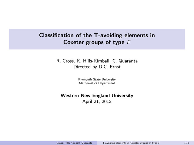 This talk was given by my undergraduate research students Ryan Cross, Katie Hills-Kimball, and Christie Quaranta (Plymouth State University) on April 21, 2012 at the 2012 Hudson River Undergraduate Mathematics Conference at Western New England University.