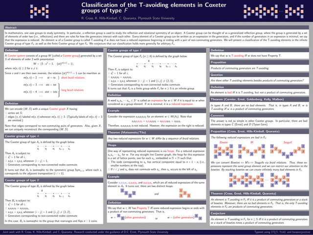5 Classification of the T-avoiding elements in Coxeter groups of type F R. Cross, K. Hills-Kimball, C. Quaranta, Plymouth State University 1 3 5 2 4 3 2 4 1 3 5 2 4 3 2 4 1 3 5 · · · 1 3 5 2 4 3 2 4 1 3 5 Abstract In mathematics, one uses groups to study symmetry. In particular, a reflection group is used to study the reflection and rotational symmetry of an object. A Coxeter group can be thought of as a generalized reflection group, where the group is generated by a set of elements of order two (i.e., reflections) and there are rules for how the generators interact with each other. Every element of a Coxeter group can be written as an expression in the generators, and if the number of generators in an expression is minimal, we say that the expression is reduced. An element w of a Coxeter group is called T-avoiding if w does not have a reduced expression beginning or ending with a pair of non-commuting generators. We will present a classification of the T-avoiding elements in the infinite Coxeter group of type F5 , as well as the finite Coxeter group of type F4 . We conjecture that our classification holds more generally for arbitrary Fn . Definition A Coxeter system consists of a group W (called a Coxeter group) generated by a set S of elements of order 2 with presentation W = S : s2 = 1, (st)m(s,t) = 1 , where m(s, t) ≥ 2 for s = t. Since s and t are their own inverses, the relation (st)m(s,t) = 1 can be rewritten as m(s, t) = 2 =⇒ st = ts short braid relations m(s, t) = 3 =⇒ sts = tst m(s, t) = 4 =⇒ stst = tsts . . . long braid relations Definition We can encode (W , S) with a unique Coxeter graph X having: 1. vertex set S; 2. edges {s, t} labeled m(s, t) whenever m(s, t) ≥ 3. (Typically labels of m(s, t) = 3 are omitted.) Note that edges correspond to non-commuting pairs of generators. Also, given X, we can uniquely reconstruct the corresponding (W , S). Coxeter groups of type A The Coxeter group of type An is defined by the graph below. s1 s2 s3 · · · sn−1 sn Then An is subject to: 1. s2 i = 1 for all i, 2. si sj si = sj si sj whenever |i − j| = 1, 3. Generators corresponding to non-connected nodes commute. It turns out that An is isomorphic to the symmetric group Symn+1 , where each si corresponds to the adjacent transposition (i i + 1). Coxeter groups of type B The Coxeter group of type Bn is defined by the graph below. s1 s2 s3 4 · · · sn−1 sn Then Bn is subject to: 1. s2 i = 1 for all i, 2. s1 s2 s1 s2 = s2 s1 s2 s1 , 3. si sj si = sj si sj whenever |i − j| = 1 and {i, j} = {1, 2}, 4. Generators corresponding to non-connected nodes commute. In this case, Bn is isomorphic to the group that rearranges and flips n − 1 coins. Coxeter groups of type F The Coxeter group of type Fn (n ≥ 4) is defined by the graph below. s1 s2 s3 s4 4 · · · sn−1 sn Then Fn is subject to: 1. s2 i = 1 for all i, 2. s2 s3 s2 s3 = s3 s2 s3 s2 , 3. si sj si = sj si sj whenever |i − j| = 1 and {i, j} = {2, 3}, 4. Generators corresponding to non-connected nodes commute. It turns out that F4 is a finite group while Fn for n ≥ 5 is an infinite group. Definition A word sx1 sx2 · · · sxm ∈ S∗ is called an expression for w ∈ W if it is equal to w when considered as a group element. If m is minimal, it is a reduced expression. Example Consider the expression s1 s3 s2 s1 s2 for an element w ∈ W (A3 ). Note that s1 s3 s2 s1 s2 = s1 s3 s1 s2 s1 = s3 s1 s1 s2 s1 = s3 s2 s1. Therefore, s1 s3 s2 s1 s2 is not reduced. However, the expression on the right is reduced. Theorem (Matsumoto/Tits) Any two reduced expressions for w ∈ W differ by a sequence of braid relations. Heaps One way of representing reduced expressions is via heaps. Fix a reduced expression sx1 sx2 · · · sxm for w. For any straight line Coxeter graph, the heap for this expression is a set of lattice points, one for each sxi , embedded in N × N such that: 1. The node corresponding to sxi has vertical component equal to n + 1 − xi (i.e., smaller numbers at the top), 2. If i < j and sxi does not commute with sxj , then sxi occurs to the left of sxj . Example Consider s1 s2 s3 s2 , s1 s3 s2 s3 , and s3 s1 s2 s3 , which are all reduced expressions of the same element in A3 . It turns out, there are two distinct heaps: 1 2 3 2 and 1 3 2 3 Definition We say that w ∈ W has Property T iff some reduced expression begins or ends with a product of non-commuting generators. That is, w = s t (other generators) or w = (other generators) t s Definition We say that w is T-avoiding iff w does not have Property T. Proposition Products of commuting generators are T-avoiding. Question Are there other T-avoiding elements besides products of commuting generators? Definition An element is bad iff it is T-avoiding, but not a product of commuting generators. Theorem (Cormier, Ernst, Goldenberg, Kelly, Malbon) In types A and B, there are no bad elements. That is, in types A and B, w is T-avoiding iff w is a product of commuting generators. Comment The answer is not so simple in other Coxeter groups. In particular, there are bad elements in types C (Ernst) and D (Tyson Gern). Proposition (Cross, Ernst, Hills-Kimball, Quaranta) The following reduced expressions are bad in F5 : Bowtie M Seagull 1 3 5 2 4 3 2 4 1 3 5 1 3 5 2 3 4 3 2 1 3 5 1 3 2 3 4 5 4 3 2 1 3 We can convert Bowties ↔ M’s ↔ Seagulls via braid relations. Thus, these ex- pressions represent the same group element and we can restrict our attention to the bowties. By stacking bowties we can create infinitely many bad elements in F5 . 1 3 5 2 4 3 2 4 1 3 5 2 4 3 2 4 1 3 5 · · · 1 3 5 2 4 3 2 4 1 3 5 Theorem (Cross, Ernst, Hills-Kimball, Quaranta) An element is T-avoiding in F5 iff it is a product of commuting generators or a stack of bowties. Moreover, there are no bad elements in F4 . That is, the only T-avoiding elements in F4 are products of commuting generators. Conjecture An element is T-avoiding in Fn for n ≥ 5 iff it is a product of commuting genera