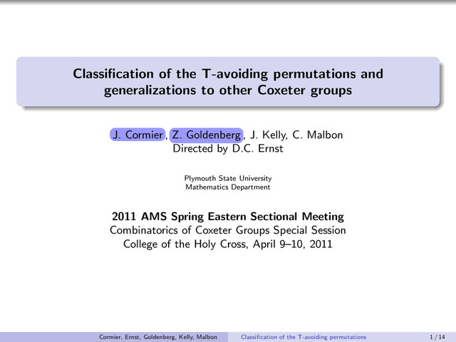 This talk was given by my undergraduate research students Joseph Cormier, Zachariah Goldenberg, Jessica Kelly, and Chris Malbon (Plymouth State University) on April 10, 2011 at the Combinatorics of Coxeter Groups Special Session of the 2011 AMS Spring Easter Sectional Meeting at the College of the Holy Cross.