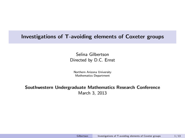 This talk was given by my undergraduate research student Selina Gilbertson on March 3, 2013 at the Southwestern Undergraduate Research Conference (SUnMaRC) at the University of New Mexico.