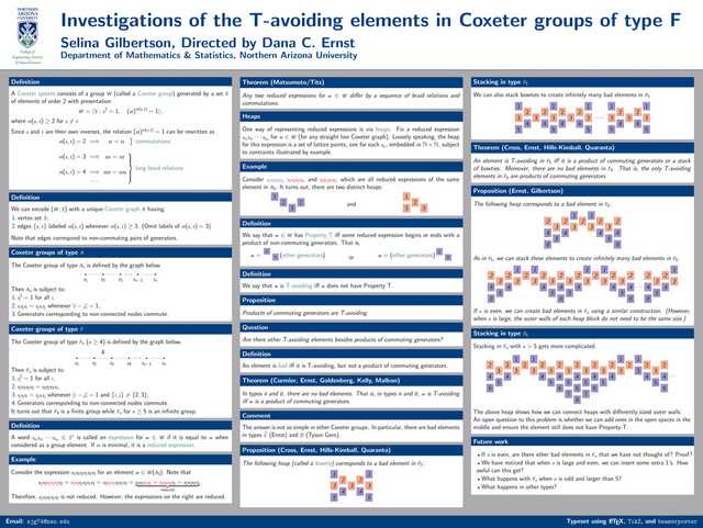 F Selina Gilbertson, Directed by Dana C. Ernst Department of Mathematics & Statistics, Northern Arizona University Definition A Coxeter system consists of a group W (called a Coxeter group) generated by a set S of elements of order 2 with presentation W = S : s2 = 1, (st)m(s,t) = 1 , where m(s, t) ≥ 2 for s = t. Since s and t are their own inverses, the relation (st)m(s,t) = 1 can be rewritten as m(s, t) = 2 =⇒ st = ts commutations m(s, t) = 3 =⇒ sts = tst m(s, t) = 4 =⇒ stst = tsts . . . long braid relations Definition We can encode (W , S) with a unique Coxeter graph X having: 1. vertex set S; 2. edges {s, t} labeled m(s, t) whenever m(s, t) ≥ 3. (Omit labels of m(s, t) = 3) Note that edges correspond to non-commuting pairs of generators. Coxeter groups of type A The Coxeter group of type An is defined by the graph below. s1 s2 s3 · · · sn−1 sn Then An is subject to: 1. s2 i = 1 for all i, 2. sisjsi = sjsisj whenever |i − j| = 1, 3. Generators corresponding to non-connected nodes commute. Coxeter groups of type F The Coxeter group of type Fn (n ≥ 4) is defined by the graph below. s1 s2 s3 s4 4 · · · sn−1 sn Then Fn is subject to: 1. s2 i = 1 for all i, 2. s2s3s2s3 = s3s2s3s2 , 3. sisjsi = sjsisj whenever |i − j| = 1 and {i, j} = {2, 3}, 4. Generators corresponding to non-connected nodes commute. It turns out that F4 is a finite group while Fn for n ≥ 5 is an infinite group. Definition A word sx1 sx2 · · · sxm ∈ S∗ is called an expression for w ∈ W if it is equal to w when considered as a group element. If m is minimal, it is a reduced expression. Example Consider the expression s1s3s2s1s2s3 for an element w ∈ W (A3 ). Note that s1s3s2s1s2s3 = s1s3s1s2s1s3 = s3s1s1s2s1s3 = s3s2s1s3 = s3s2s3s1 = s2s3s2s1 reduced . Therefore, s1s3s2s1s2 is not reduced. However, the expressions on the right are reduced. Theorem (Matsumoto/Tits) Any two reduced expressions for w ∈ W differ by a sequence of braid relations and commutations. Heaps One way of representing reduced expressions is via heaps. Fix a reduced expression sx1 sx2 · · · sxm for w ∈ W (for any straight line Coxeter graph). Loosely speaking, the heap for this expression is a set of lattice points, one for each sxi , embedded in N×N, subject to contraints illustrated by example. Example Consider s1s2s3s2 , s1s3s2s3 , and s3s1s2s3 , which are all reduced expressions of the same element in A3 . It turns out, there are two distinct heaps: 1 2 3 2 and 1 3 2 3 Definition We say that w ∈ W has Property T iff some reduced expression begins or ends with a product of non-commuting generators. That is, w = s t (other generators) or w = (other generators) t s Definition We say that w is T-avoiding iff w does not have Property T. Proposition Products of commuting generators are T-avoiding. Question Are there other T-avoiding elements besides products of commuting generators? Definition An element is bad iff it is T-avoiding, but not a product of commuting generators. Theorem (Cormier, Ernst, Goldenberg, Kelly, Malbon) In types A and B, there are no bad elements. That is, in types A and B, w is T-avoiding iff w is a product of commuting generators. Comment The answer is not so simple in other Coxeter groups. In particular, there are bad elements in types C (Ernst) and D (Tyson Gern). Proposition (Cross, Ernst, Hills-Kimball, Quaranta) The following heap (called a bowtie) corresponds to a bad element in F5 : 1 3 5 2 4 3 2 4 1 3 5 Stacking in type F5 We can also stack bowties to create infinitely many bad elements in F5 . 1 3 5 2 4 3 2 4 1 3 5 2 4 3 2 4 1 3 5 · · · 1 3 5 2 4 3 2 4 1 3 5 Theorem (Cross, Ernst, Hills-Kimball, Quaranta) An element is T-avoiding in F5 iff it is a product of commuting generators or a stack of bowties. Moreover, there are no bad elements in F4 . That is, the only T-avoiding elements in F4 are products of commuting generators. Proposition (Ernst, Gilbertson) The following heap corresponds to a bad element in F6 : 2 4 6 3 5 2 4 1 3 2 1 3 2 4 3 5 2 4 6 As in F5 , we can stack these elements to create infinitely many bad elements in F6 . 2 4 6 3 5 2 4 1 3 2 1 3 2 4 3 5 2 4 6 3 5 2 4 1 3 2 1 3 2 4 3 5 2 4 6 · · · 2 4 6 3 5 2 4 1 3 If n is even, we can create bad elements in Fn using a similar construction. (However, when n is large, the outer walls of each heap block do not need to be the same size.) Stacking in type F6 Stacking in Fn with n > 5 gets more complicated. 2 4 6 3 5 2 4 1 3 2 1 3 2 4 3 5 2 4 6 3 5 7 2 4 6 8 3 5 7 2 4 6 3 5 2 4 1 3 2 1 3 2 4 3 5 2 4 6 · · · The above heap shows how we can connect heaps with differently sized outer walls. An open question to this problem is whether we can add ones in the open spaces in the middle and ensure the element still does not have Property-T. Future work If n is even, are there other bad elements in Fn that we have not thought of? Proof? We have noticed that when n is large and even, we can insert some extra 1’s. How awful can this get? What happens with Fn when n is odd and larger than 5? What happens in other types? Email: