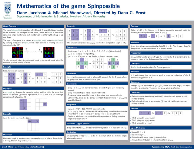 . . . .. . . . . .. . . . .. . . . .. . . . .. . . . . .. . . . .. . . . .. . . . .. . . . . .. . . . .. . . . .. . . . .. . . . . .. . . . .. . . . . .. . . . .. . . . .. Mathematics of the game Spinpossible Dane Jacobson & Michael Woodward, Directed by Dana C. Ernst Department of Mathematics & Statistics, Northern Arizona University . .Game Summary . . The game Spinpossible is played on a 3×3 board. A scrambled board consists of the numbers 1–9 arranged on the board, where each tile of the board contains a single number and that number can be either right side up or up side down. The object of the game is to convert a scrambled board into the solved board by applying a sequence of spins, where a spin consists of rotating an m × n subrectangles by 180◦. ? − → · · · ? − → To win, you must return the scrambled board to the solved board using the minimum possible number of spins. . .Example . . Let’s play with an example: . . 2 . 9 . 1 . 4 . 6 . 5 . 7 . 3 . 8 → . . 2 . 8 . 3 . 4 . 5 . 6 . 7 . 1 . 9 → . . 2 . 1 . 3 . 4 . 5 . 6 . 7 . 8 . 9 → . . 1 . 2 . 3 . 4 . 5 . 6 . 7 . 8 . 9 . .Defintion . . A rectangle Rij denotes the rectangle having position (i) in the upper left corner and position (j) in lower right corner. If i = j, then Rii is the rectangle consisting only of position (i). . . (i) . . . . . . . (j) . . . . . . . . (i) . . . . .Example . . R13 is the entire top row of a board: . . (1) . . (3) . . . . . . . .Definition . . Given a rectangle R, we denote the corresponding spin of R by sR . In particular, if R = Rij , then we may write sR = sij . . .Example . . . . 2 . 9 . 1 . 4 . 6 . 5 . 7 . 3 . 8 s29 − → . . 2 . 8 . 3 . 4 . 5 . 6 . 7 . 1 . 9 s28 − → . . 2 . 1 . 3 . 4 . 5 . 6 . 7 . 8 . 9 s12 − → . . 1 . 2 . 3 . 4 . 5 . 6 . 7 . 8 . 9 This solution is expressed as s12s28s29 , like function composition (right to left). . .Comments . . ▶ 6 spin types: 1 × 1, 1 × 2, 2 × 2, 1 × 3, 2 × 3, 3 × 3 (36 total spins). ▶ sijsij is the same as “doing nothing.” ▶ sijsmn = smnsij iff Rij and Rmn are disjoint or have a common center. . . 1 . 2 . 3 . 4 . 5 . 6 . 7 . 8 . 9 → . . 1 . 8 . 3 . 6 . 5 . 4 . 7 . 2 . 9 ← . . 1 . 2 . 3 . 4 . 5 . 6 . 7 . 8 . 9 . .Definition . . Spin3×3 is the group generated by all possible spins of the 3 × 3 board, where the group operation is composition of spins. . .Comments . . ▶ Every b ∈ Spin3×3 can be expressed as a product of spins (not necessarily unique). ▶ Every product of spins yields a scrambled board. ▶ Conversely, every scrambled board is determined by a product of spins. ▶ Consequently, there is a 1-1 correspondence between elements of Spin3×3 and scrambled boards. . .Properties . . ▶ |Spin3×3| = 9!29 = 185, 794, 560 possible boards. ▶ If b ∈ Spin3×3 , then b−1 will return the corresponding scrambled board to the solved board. In other words, b−1b corresponds to the solved board. ▶ Finding a solution to a scrambled board is equivalent to finding a minimal length expression for b−1. . .Theorem (Upper Bound) . . Every element of Spinm×n can be expressed as a product of at most 3mn-(m+n). . .Definition . . We define the number k(m, n) to be the maximum of all the minimal length solutions in Spinm×n . . .Example . . Claim: k(1, 2) = 3. |Spin1×2| = 8, but an exhaustive approach yields the following maximally scrambled board in Spin1×2 . . . 2 . 1 → . . 1 . 2 → . . 1 . 2 → . . 1 . 2 . .Theorem . . It has been shown computationally that k(3, 3) = 9. That is, every board in Spinpossible can be unscrambled in at most 9 moves. . .Proposition . . Spin3×3 is the Coxeter group of type B9 , equivalently, it is isomorphic to the symmetry group of the 9-dimensional hypercube. . .Definition . . A reflection is a conjugation of a Coxeter generator. . .Theorem . . It is well-known that the longest word in terms of reflections of the 9- dimensional hypercube is 9. . .Comment . . The spin s13 can be written as c0c1c2c0c1c0 , which is of even length, and hence cannot be a conjugate. Therefore, not every spin is a reflection. . .Definition . . ▶ If tile i is upside down in any position (j), then tile i will require an odd number of spins. ▶ If tile i is rightside up in any position (j), then tile i will require an even number of spins. . .Example . . . . 3 . 1 . 2 s13 − → . . 2 . 1 . 3 s12 − → . . 1 . 2 . 3 ▶ Tile 1 spin path: s12s13 (even) ▶ Tile 2 spin path: s12s13 (even) ▶ Tile 3 spin path: s13 (odd) . .Open Problems . . ▶ Show k(2, 2) = 5. ▶ Determine k(4, 4). ▶ Determine which spin types sij are equivalent. ▶ Analyze the distribution of solution lengths in Spinm×n . Email: Dane [