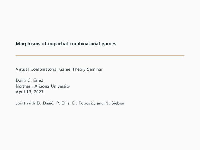 The aim of this talk is to formalize some folklore from combinatorial game theory and to introduce a few new results concerning morphisms of impartial games, one of which we can think of as the First Isomorphism Theorem for impartial games. This is preliminary work that was initiated at the most recent Combinatorial Game Theory Colloquium in the Azores. This is joint work with Bojan Bašić, Paul Ellis, Danijela Popović, and Nándor Sieben.