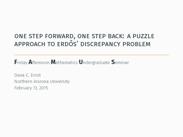 In the 1930s, the famous Hungarian mathematician, Paul Erdős, thought that for any infinite sequence of +1 and -1, it would always be possible to find a finite subsequence consisting of every nth term up to some point summing to a number larger than any you choose. But Erdős could not prove his conjecture, which he referred to as the "discrepancy problem." About a year ago, Lisitsa and Konev published a proof that is a significant step towards proving Erdős' problem. Their computer-assisted proof resulted in headlines such as "Wikipedia-size maths proof too big for humans to check" because their proof is as large as the entire content of Wikipedia, making it unlikely that it will ever be checked by a human being. In this episode of FAMUS, we will tinker with Erdős’ puzzle and attempt to wrap our heads around its difficulty.