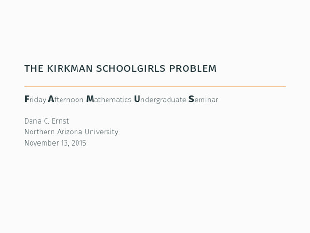Here “abreast” means “in a group,” so the girls are walking out in groups of three, and each pair of girls should only be in the same group once. It turns out that this problem is harder than it looks. Is it even possible? We will begin by tinkering with a simpler problem and then spend some time playing with Kirkman's original problem. Time permitting, we will also discuss generalizations of the problem that form the backbone of a branch of mathematics called combinatorial design theory.