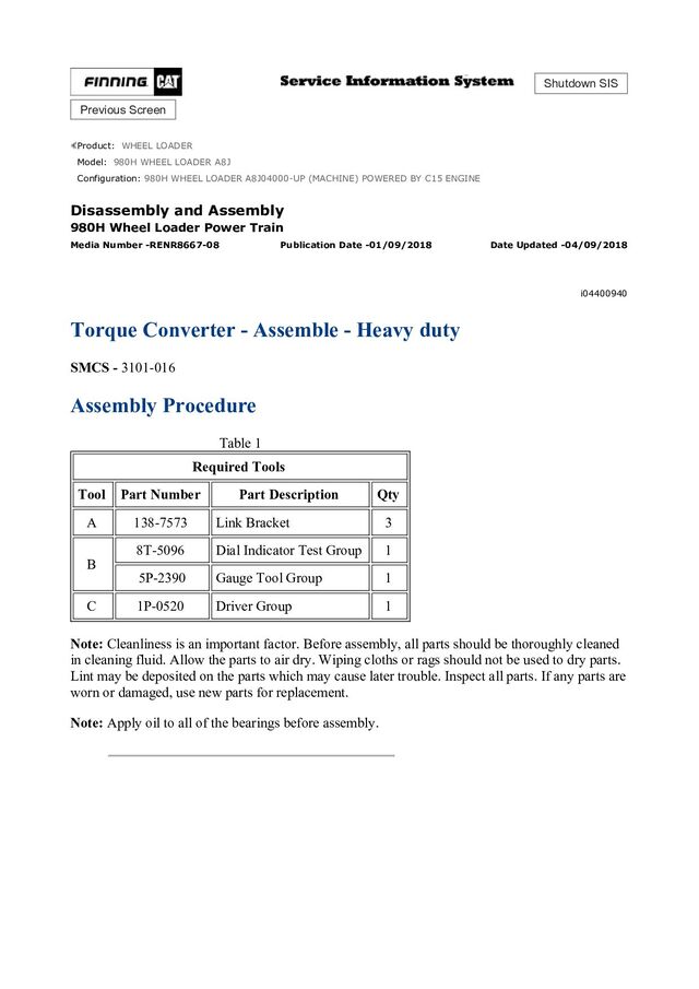 LOADER A8J Configuration: 980H WHEEL LOADER A8J04000-UP (MACHINE) POWERED BY C15 ENGINE Disassembly and Assembly 980H Wheel Loader Power Train Media Number -RENR8667-08 Publication Date -01/09/2018 Date Updated -04/09/2018 i04400940 Torque Converter - Assemble - Heavy duty SMCS - 3101-016 Assembly Procedure Table 1 Required Tools Tool Part Number Part Description Qty A 138-7573 Link Bracket 3 B 8T-5096 Dial Indicator Test Group 1 5P-2390 Gauge Tool Group 1 C 1P-0520 Driver Group 1 Note: Cleanliness is an important factor. Before assembly, all parts should be thoroughly cleaned in cleaning fluid. Allow the parts to air dry. Wiping cloths or rags should not be used to dry parts. Lint may be deposited on the parts which may cause later trouble. Inspect all parts. If any parts are worn or damaged, use new parts for replacement. Note: Apply oil to all of the bearings before assembly.